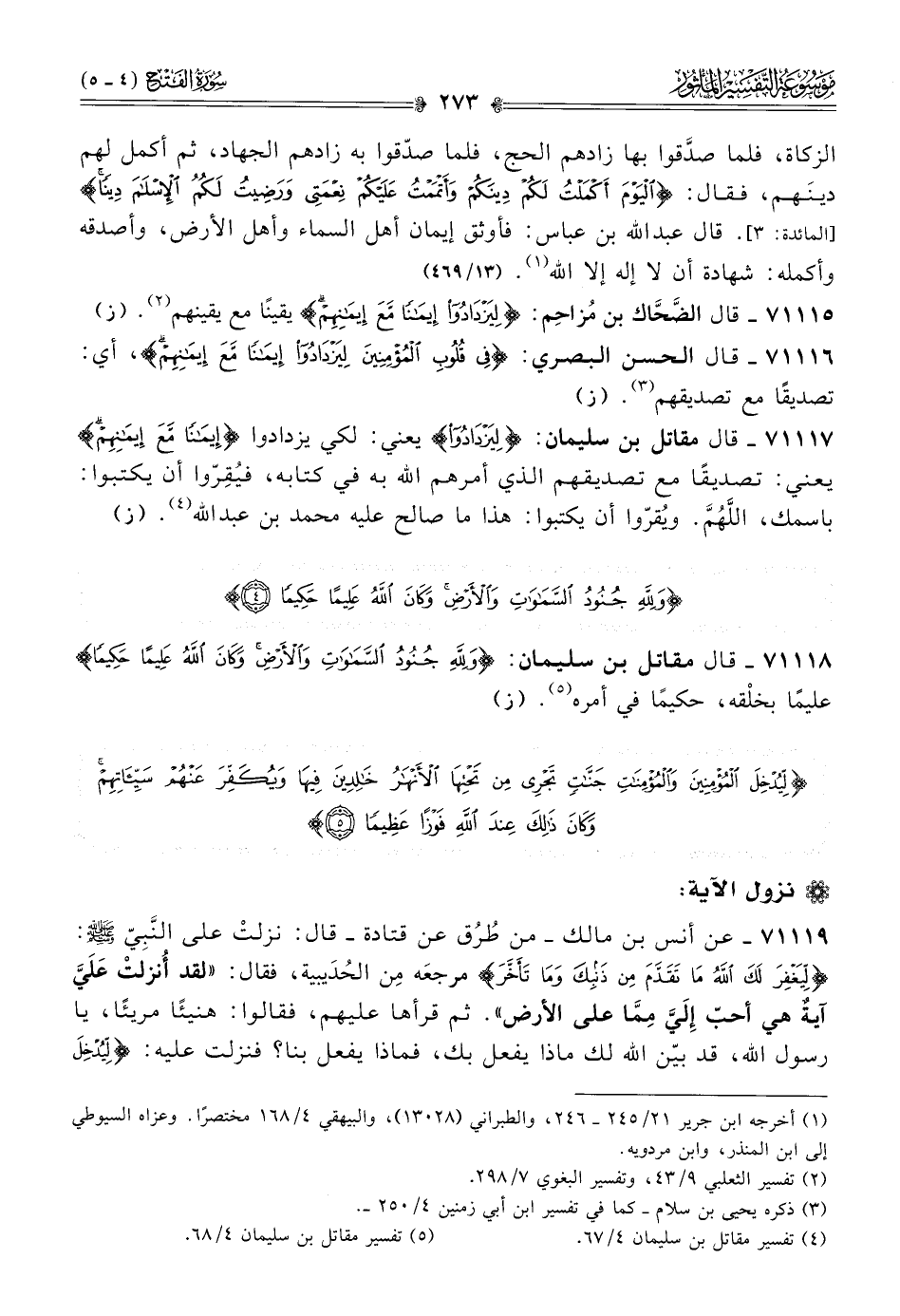 ٧١١١٦ - قال الحسن البصري: {فِي قُلُوبِ المُؤْمِنِينَ لِيَزْدادُوا إيمانًا مَعَ إيمانِهِمْ}، أي: تصديقًا مع تصديقهم (¬٣). (ز)