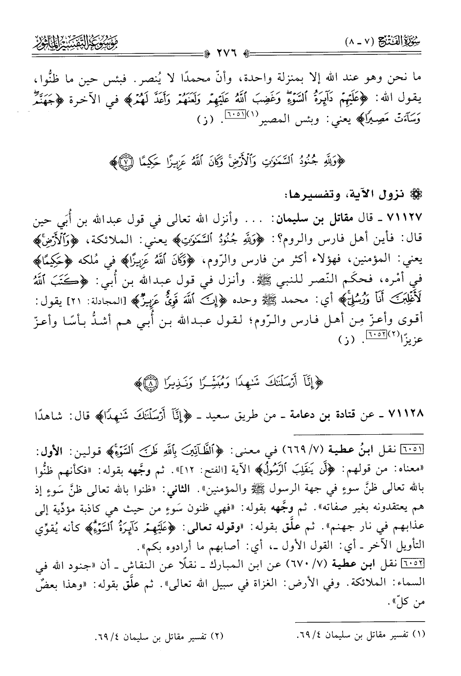 [٦٠٥٢] نقل ابن عطية (٧/ ٦٧٠) عن ابن المبارك -نقلًا عن النقاش- أن «جنود الله في السماء: الملائكة. وفي الأرض: الغزاة في سبيل الله تعالى». ثم علَّق بقوله: «وهذا بعضٌ من كلّ».