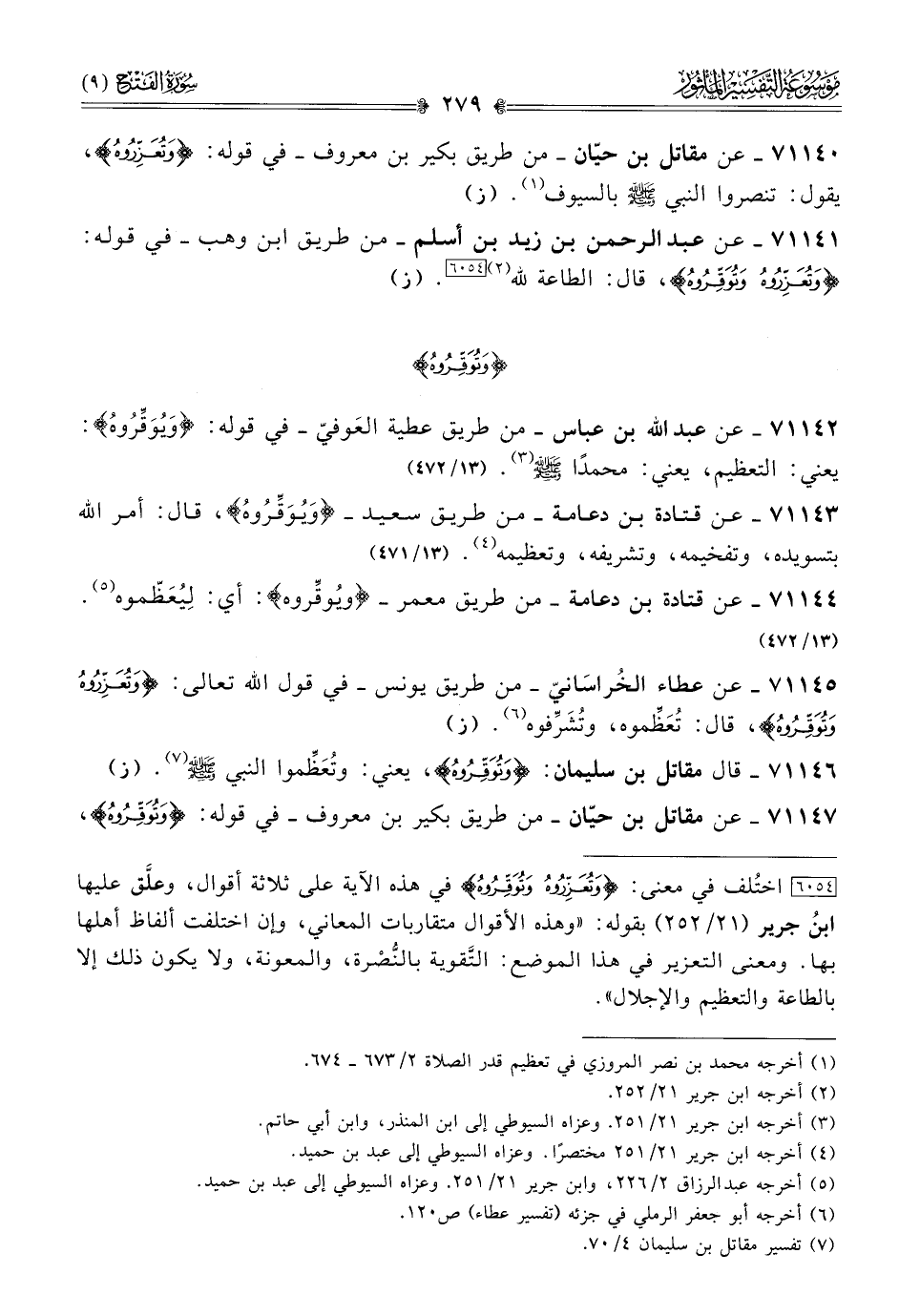 ٧١١٤٢ - عن عبد الله بن عباس -من طريق عطية العَوفيّ- في قوله: «ويُوَقِّرُوهُ»: يعني: التعظيم، يعني: محمدًا - صلى الله عليه وسلم - (¬٣). (١٣/ ٤٧٢)