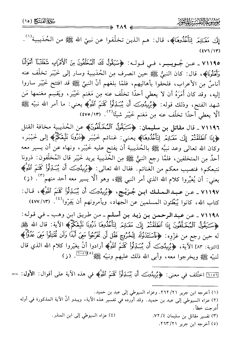 ٧١١٩٧ - عن عبد الملك ابن جُرَيْج، {يُرِيدُونَ أنْ يُبَدِّلُوا كَلامَ اللَّهِ}، قال: كتاب الله، كانوا يُبَطِّئون المسلمين عن الجهاد، ويأمرونهم أن يَفِرّوا (¬٤). (ز)