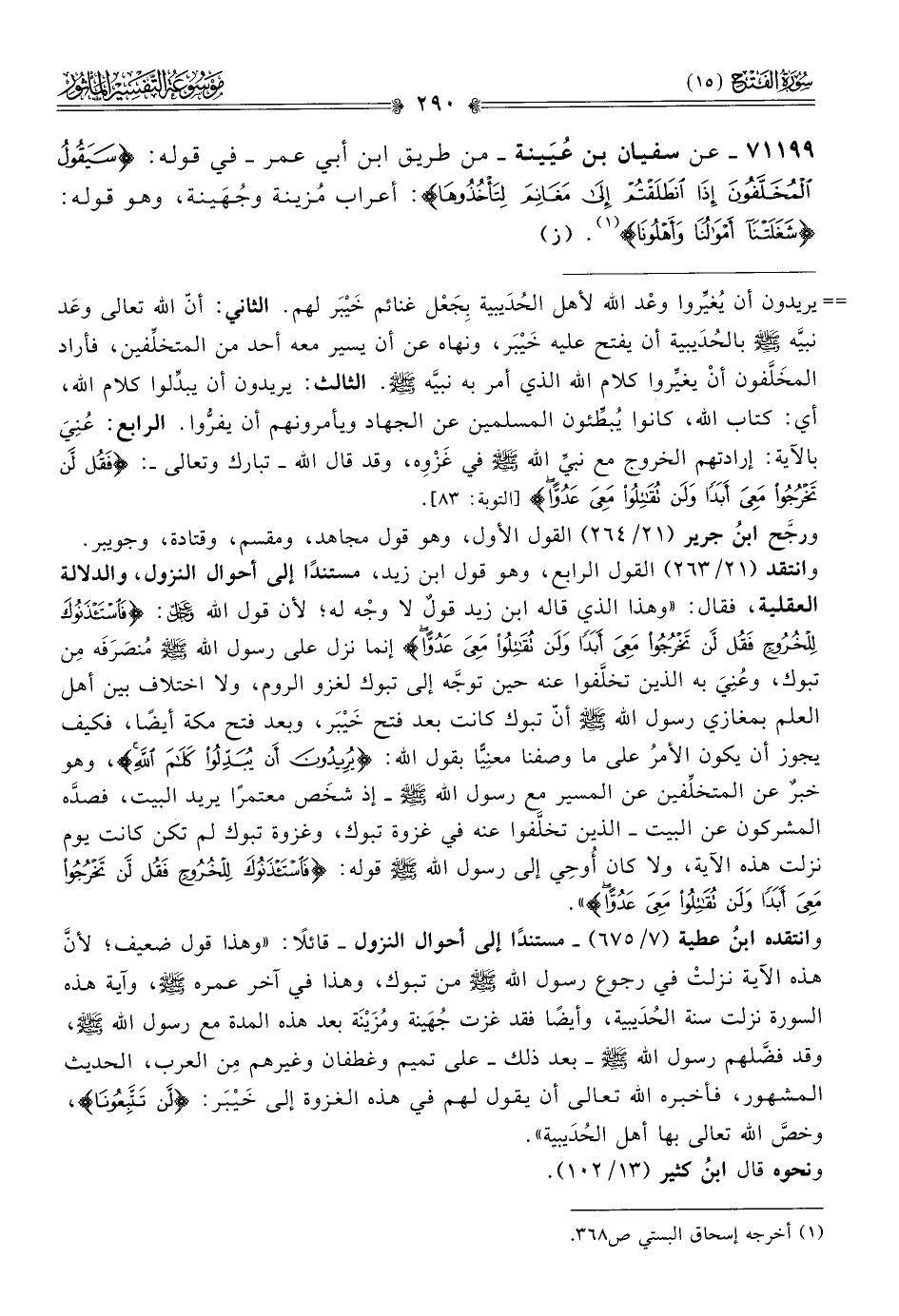 ٧١١٩٩ - عن سفيان بن عُيَينة -من طريق ابن أبي عمر- في قوله: {سيقول المخلفون إذا انطلقتم إلى مغانم لتأخذوها}: أعراب مُزينة وجُهَينة، وهو قوله: {شغلتنا أموالنا وأهلونا} (¬١). (ز)