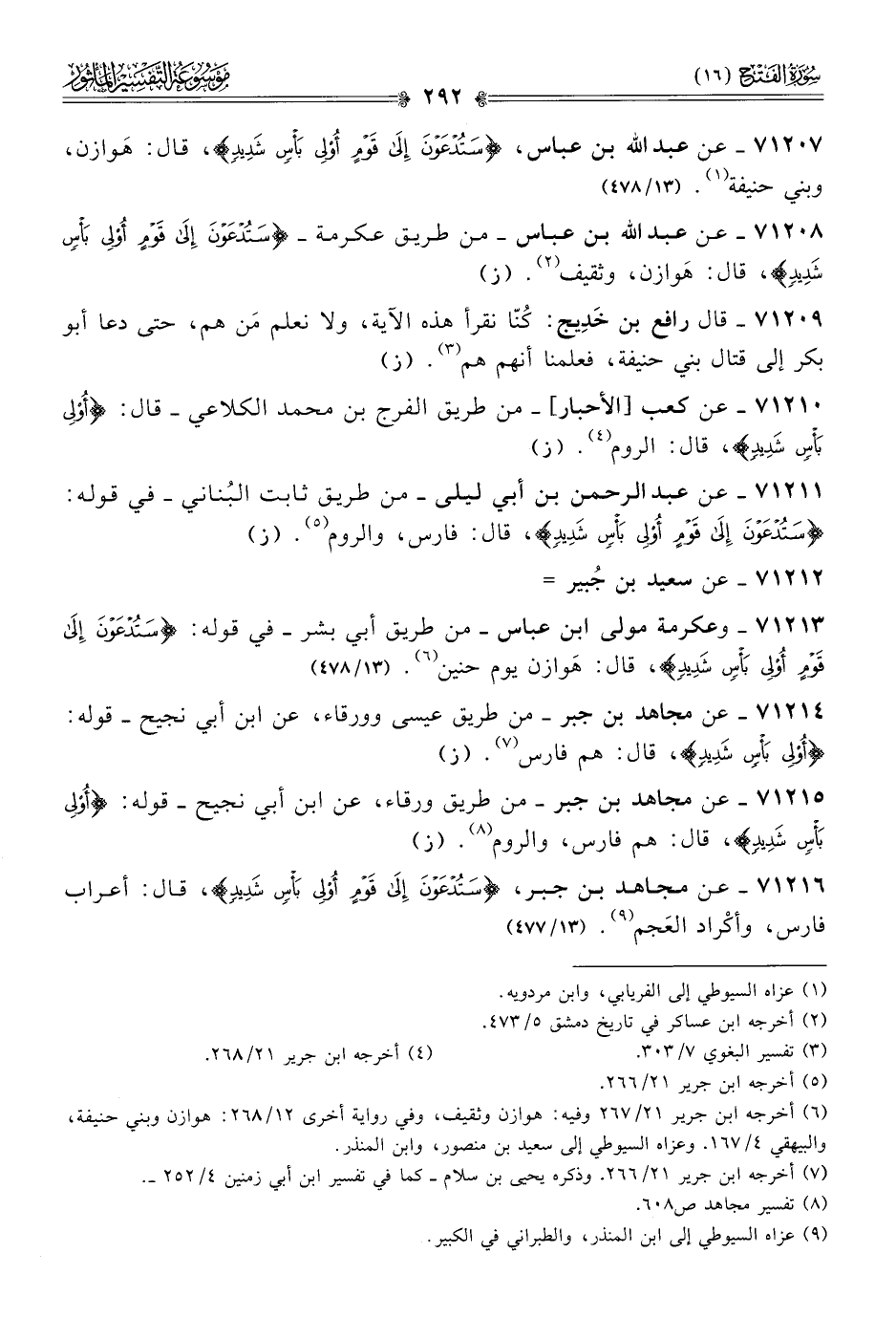 ٧١٢٠٧ - عن عبد الله بن عباس، {سَتُدْعَوْنَ إلى قَوْمٍ أُولِي بَأْسٍ شَدِيدٍ}، قال: هَوازن، وبني حنيفة (¬١). (١٣/ ٤٧٨)