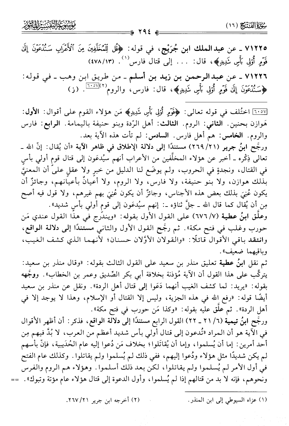 ورجَّح ابنُ تيمية (٦/ ٢١ - ٢٢) القول الرابع مستندًا إلى دلالة الواقع، فذكر: أن أظهر الأقوال في الآية هو أن المراد «تُدعون إلى قتال أولي بأس شديد أعظم من العرب، لا بُدَّ فيهم مِن أحد أمرين: إما أن يُسلموا، وإما أن يُقاتَلوا؛ بخلاف مَن دُعوا إليه عام الحُدَيبية، فإنّ بأسهم لم يكن شديدًا مثل هؤلاء ودُعوا إليهم، ففي ذلك لم يُسلموا ولم يقاتلوا. وكذلك عام الفتح في أول الأمر لم يُسلموا ولم يقاتلوا، لكن بعد ذلك أسلموا. وهؤلاء هم الروم والفرس ونحوهم، فإنه لابد من قتالهم إذا لم يُسلموا، وأول الدعوة إلى قتال هؤلاء عام مؤتة وتبوك».