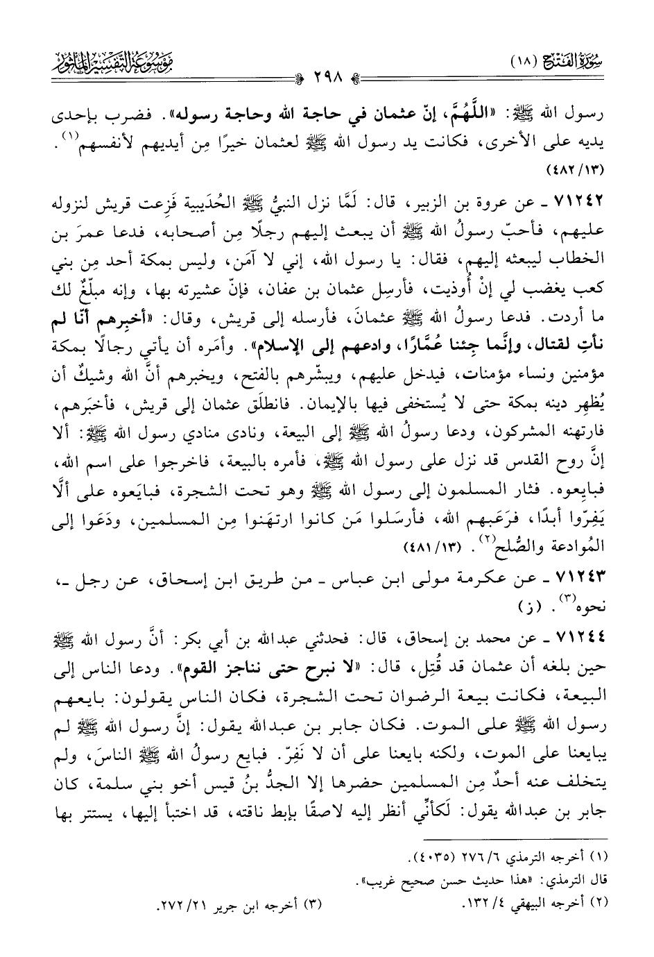 ٧١٢٤٤ - عن محمد بن إسحاق، قال: فحدثني عبد الله بن أبي بكر: أنّ رسول الله - صلى الله عليه وسلم - حين بلغه أن عثمان قد قُتِل، قال: «لا نبرح حتى نناجز القوم». ودعا الناس إلى البيعة، فكانت بيعة الرضوان تحت الشجرة، فكان الناس يقولون: بايعهم رسول الله - صلى الله عليه وسلم - على الموت. فكان جابر بن عبد الله يقول: إنّ رسول الله - صلى الله عليه وسلم - لم يبايعنا على الموت، ولكنه بايعنا على أن لا نَفِرّ. فبايع رسولُ الله - صلى الله عليه وسلم - الناسَ، ولم يتخلف عنه أحدٌ مِن المسلمين حضرها إلا الجدُّ بنُ قيس أخو بني سلمة، كان جابر بن عبد الله يقول: لَكأنِّي أنظر إليه لاصقًا بإبط ناقته، قد اختبأ إليها، يستتر بها