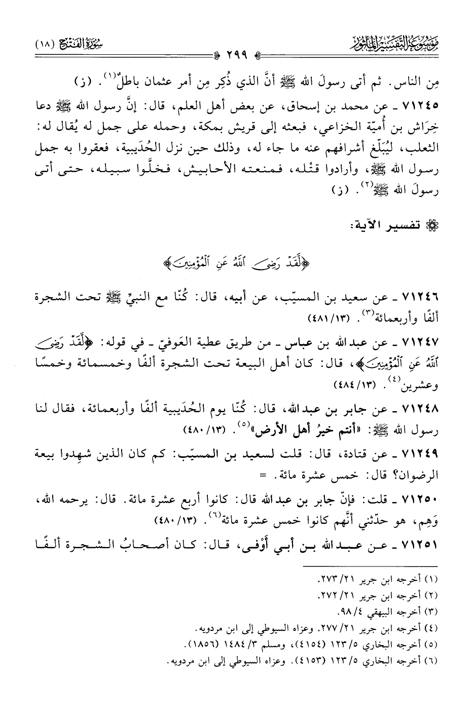 ٧١٢٤٧ - عن عبد الله بن عباس -من طريق عطية العَوفيّ- في قوله: {لَقَدْ رَضِيَ اللَّهُ عَنِ المُؤْمِنِينَ}، قال: كان أهل البيعة تحت الشجرة ألفًا وخمسمائة وخمسًا وعشرين (¬٤). (١٣/ ٤٨٤)