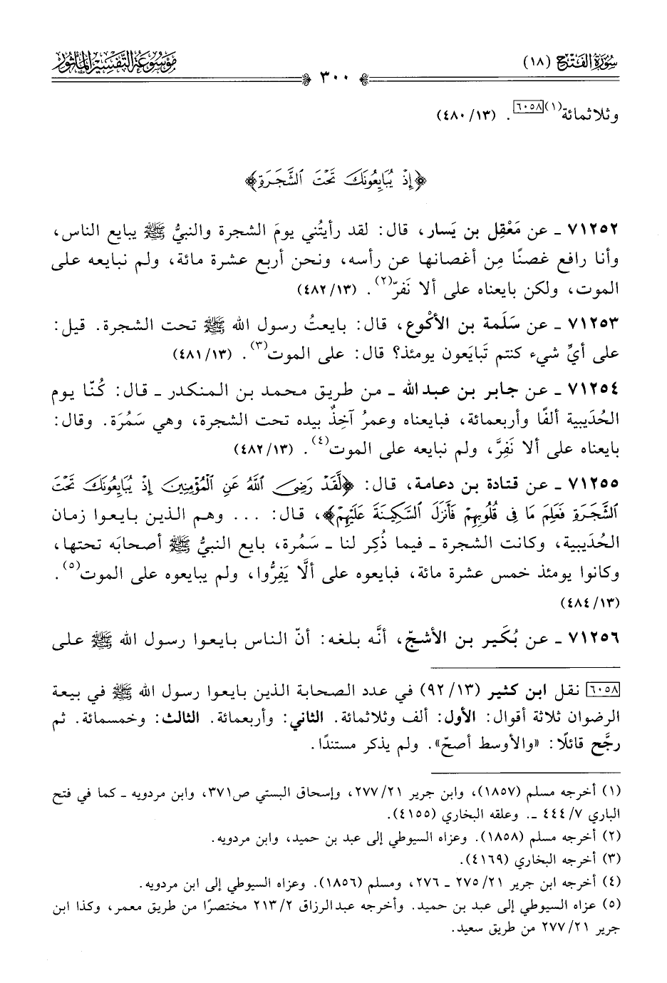 ٧١٢٥٥ - عن قتادة بن دعامة، قال: {لَقَدْ رَضِيَ اللَّهُ عَنِ المُؤْمِنِينَ إذْ يُبايِعُونَكَ تَحْتَ الشَّجَرَةِ فَعَلِمَ ما فِي قُلُوبِهِمْ فَأَنْزَلَ السَّكِينَةَ عَلَيْهِمْ}، قال: ... وهم الذين بايعوا زمان الحُدَيبية، وكانت الشجرة -فيما ذُكِر لنا- سَمُرة، بايع النبيُّ - صلى الله عليه وسلم - أصحابَه تحتها، وكانوا يومئذ خمس عشرة مائة، فبايعوه على ألّا يَفِرُّوا، ولم يبايعوه على الموت (¬٥). (١٣/ ٤٨٤)