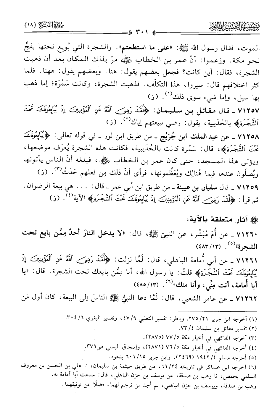 ٧١٢٥٨ - عن عبد الملك ابن جُرَيْج -من طريق ابن ثور- في قوله تعالى: {يبايعونك تحت الشجرة}، قال: سَمُرة كانت بالحُدَيبية، فكانت هذه الشجرة يُعرَف موضعها، ويؤتى هذا المسجد، حتى كان عمر بن الخطاب?، فبلغه أنّ الناس يأتونها ويُصلّون عندها فيما هُنالِك ويُعَظِّمونها، فرأى أنّ ذلك مِن فعلهم حَدَثٌ (¬٣). (ز)