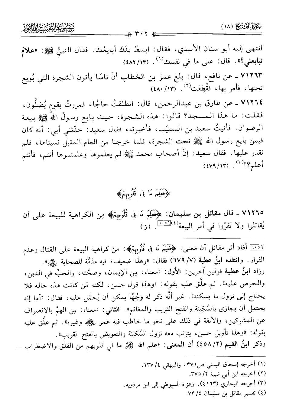 [٦٠٥٩] أفاد أثر مقاتل أن معنى: {فَعَلِمَ ما فِي قُلُوبِهِمْ}: من كراهية البيعة على القتال وعدم الفرار. وانتقده ابنُ عطية (٧/ ٦٧٩) فقال: «وهذا ضعيف؛ فيه مذمَّة للصحابة - رضي الله عنهم -».