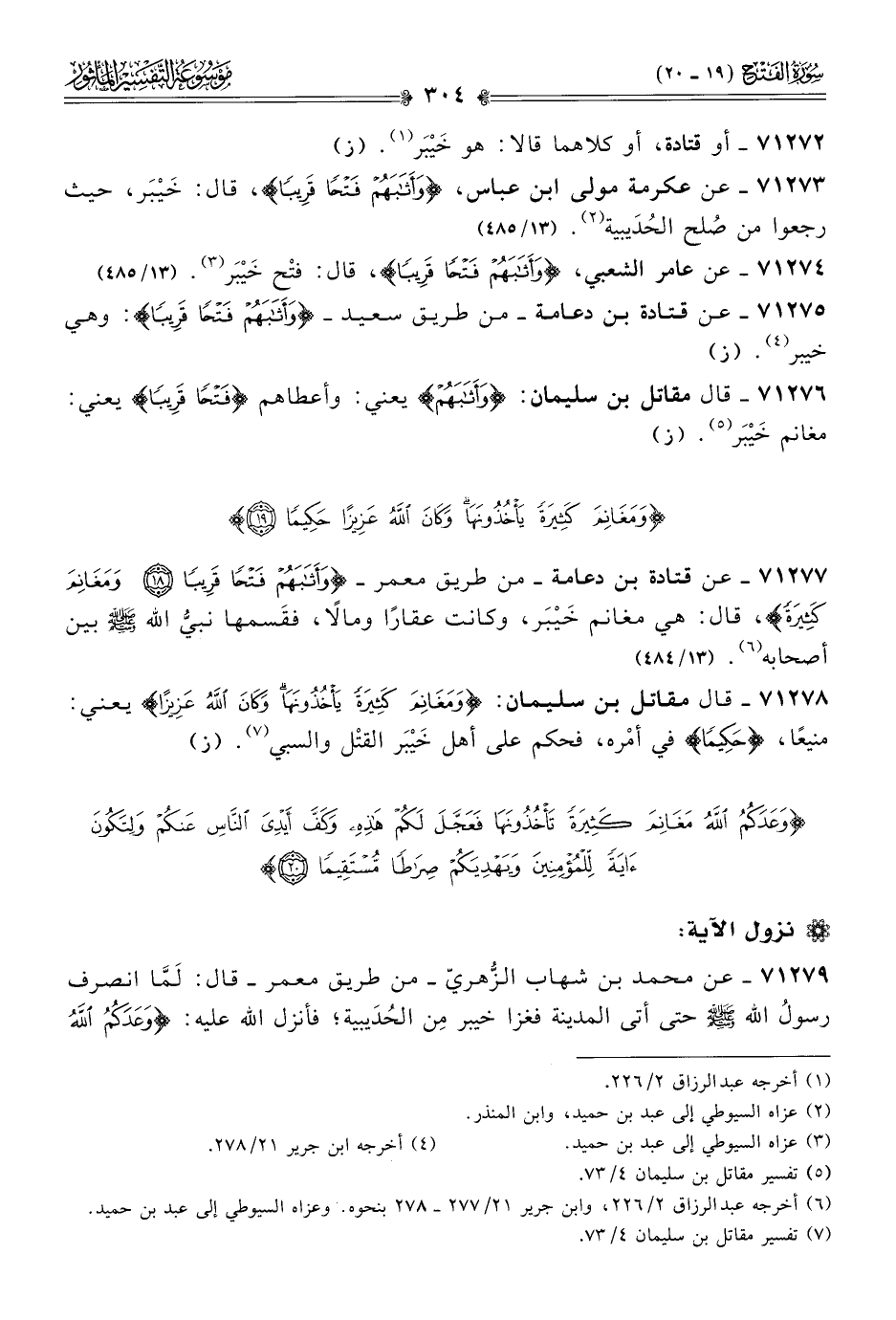 ٧١٢٧٧ - عن قتادة بن دعامة -من طريق معمر- {وأَثابَهُمْ فَتْحًا قَرِيبًا ومَغانِمَ كَثِيرَةً}، قال: هي مغانم خَيْبَر، وكانت عقارًا ومالًا، فقَسمها نبيُّ الله صلي الله عليه وسلم بين أصحابه (¬٦). (١٣/ ٤٨٤)