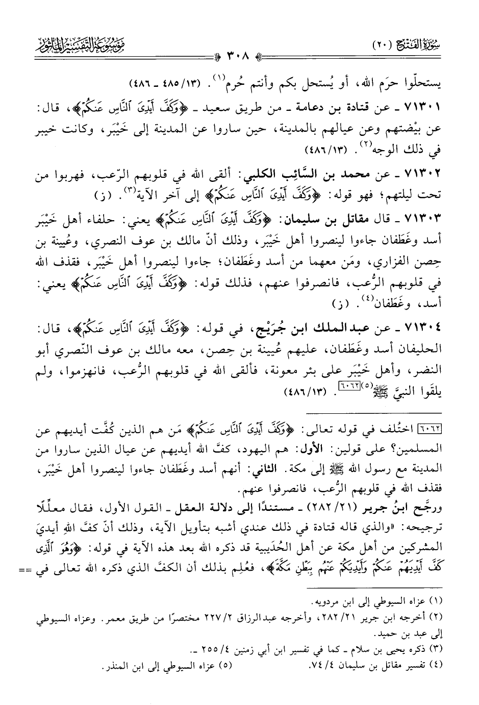 ٧١٣٠٤ - عن عبد الملك ابن جُرَيْج، في قوله: {وكَفَّ أيْدِيَ النّاسِ عَنْكُمْ}، قال: الحليفان أسد وغَطَفان، عليهم عُيينة بن حِصن، معه مالك بن عوف النّصري أبو النضر، وأهل خَيْبَر على بئر معونة، فألقى الله في قلوبهم الرُّعب، فانهزموا، ولم يلقَوا النبيَّ - صلى الله عليه وسلم - (¬٥) [٦٠٦٢]. (١٣/ ٤٨٦)