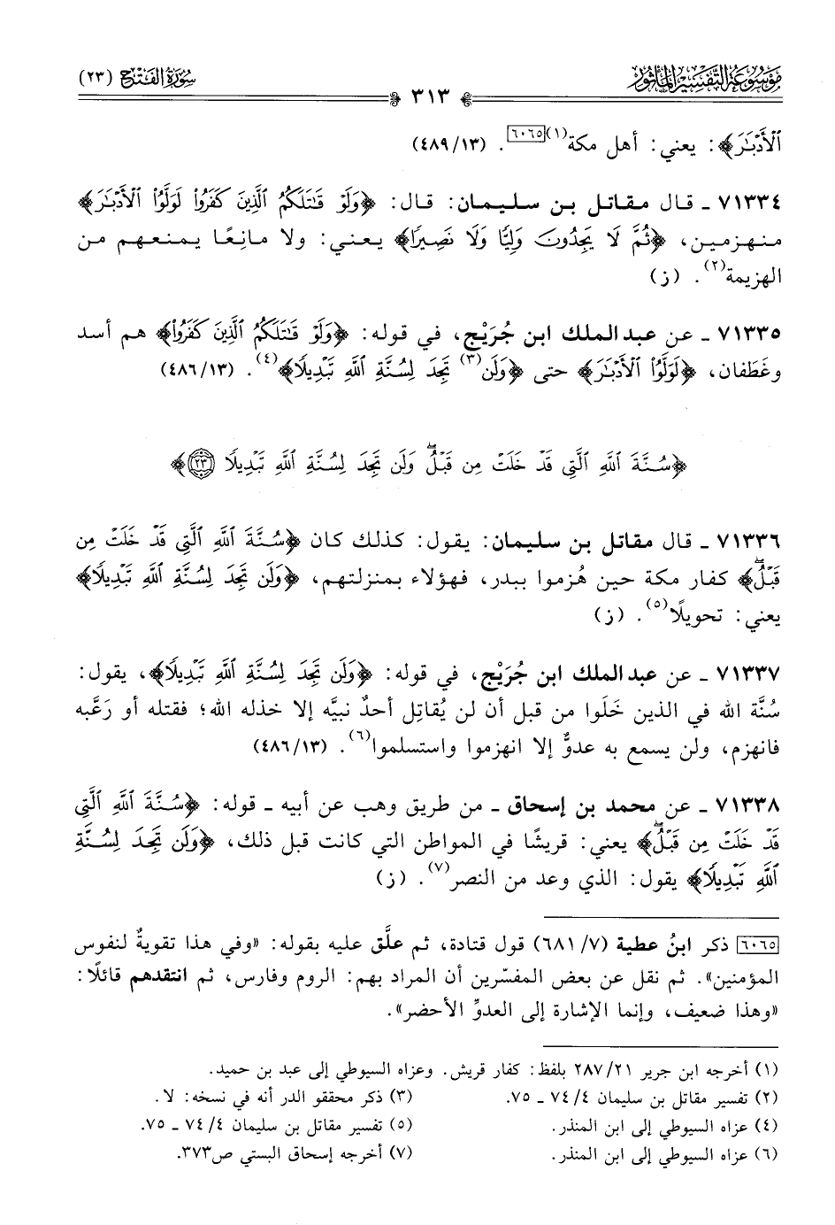 ٧١٣٣٥ - عن عبد الملك ابن جُرَيْج، في قوله: {ولَوْ قاتَلَكُمُ الَّذِينَ كَفَرُوا} هم أسد وغَطَفان، {لَوَلَّوُا الأَدْبارَ} حتى {ولَنْ (¬٣) تَجِدَ لِسُنَّةِ اللَّهِ تَبْدِيلًا} (¬٤). (١٣/ ٤٨٦)