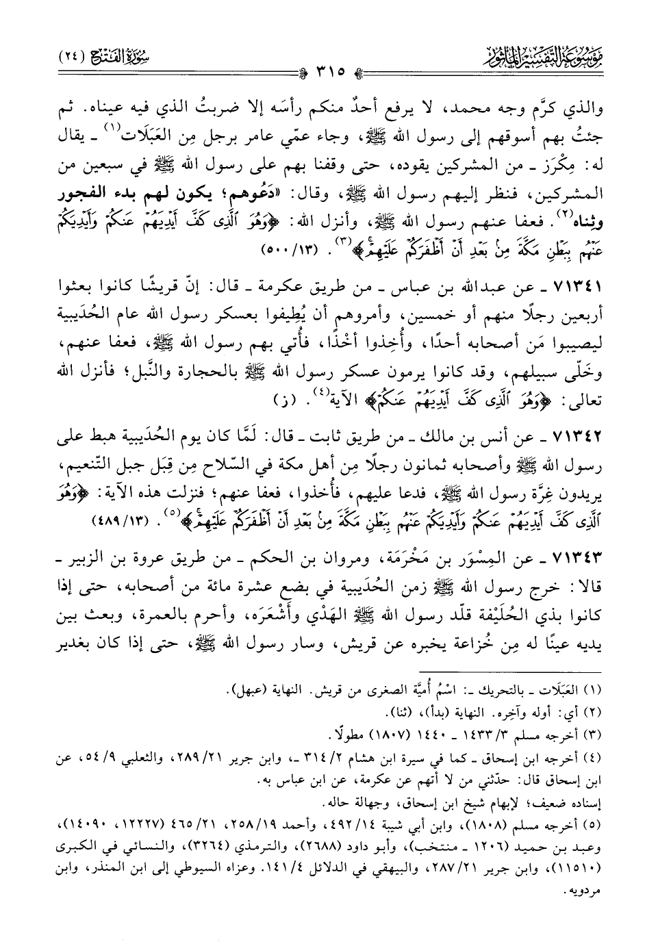 ٧١٣٤٢ - عن أنس بن مالك -من طريق ثابت- قال: لَمّا كان يوم الحُدَيبية هبط على رسول الله - صلى الله عليه وسلم - وأصحابه ثمانون رجلًا مِن أهل مكة في السّلاح مِن قِبَل جبل التّنعيم، يريدون غِرَّة رسول الله - صلى الله عليه وسلم -، فدعا عليهم، فأُخذوا، فعفا عنهم؛ فنزلت هذه الآية: {وهُوَ الَّذِي كَفَّ أيْدِيَهُمْ عَنْكُمْ وأَيْدِيَكُمْ عَنْهُمْ بِبَطْنِ مَكَّةَ مِن بَعْدِ أنْ أظْفَرَكُمْ عَلَيْهِمْ} (¬٥). (١٣/ ٤٨٩)