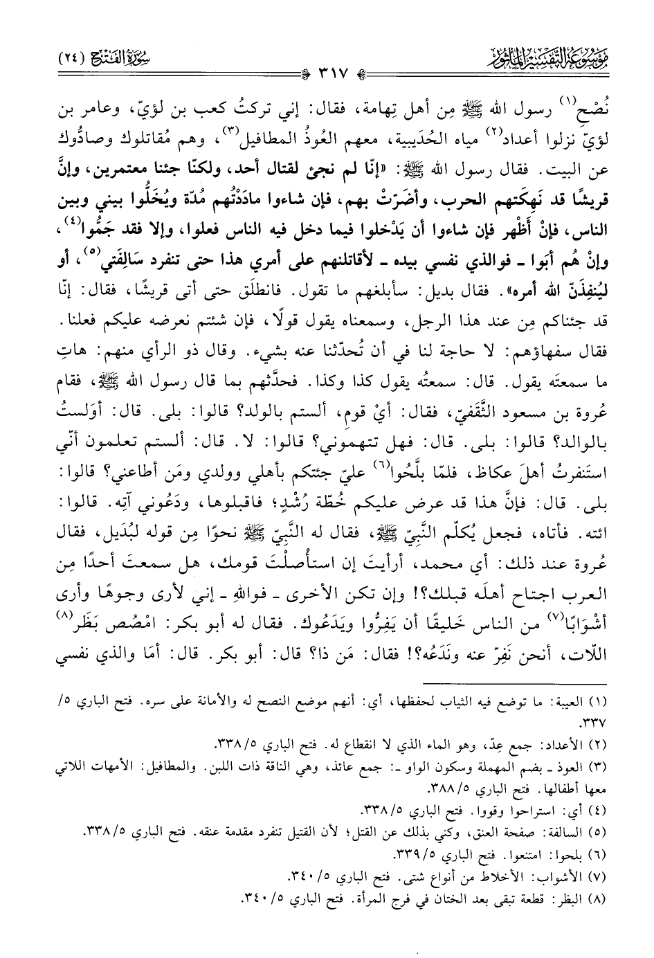 نُصْحِ (¬١) رسول الله - صلى الله عليه وسلم - مِن أهل تِهامة، فقال: إني تركتُ كعب بن لؤيّ، وعامر بن لؤيّ نزلوا أعداد (¬٢) مياه الحُدَيبية، معهم العُوذُ المطافيل (¬٣)، وهم مُقاتلوك وصادُّوك عن البيت. فقال رسول الله - صلى الله عليه وسلم -: «إنّا لم نجئ لقتال أحد، ولكنّا جئنا معتمرين، وإنّ قريشًا قد نَهِكَتهم الحرب، وأضَرّتْ بهم، فإن شاءوا مادَدْتُهم مُدّة ويُخَلُّوا بيني وبين الناس، فإنْ أظْهر فإن شاءوا أن يَدْخلوا فيما دخل فيه الناس فعلوا، وإلا فقد جَمُّوا (¬٤)، وإنْ هُم أبَوا -فوالذي نفسي بيده- لأقاتلنهم على أمري هذا حتى تنفرد سالِفَتي (¬٥)، أو ليُنفِذَنّ الله أمره». فقال بديل: سأبلغهم ما تقول. فانطلَق حتى أتى قريشًا، فقال: إنّا قد جئناكم مِن عند هذا الرجل، وسمعناه يقول قولًا، فإن شئتم نعرضه عليكم فعلنا. فقال سفهاؤهم: لا حاجة لنا في أن تُحدّثنا عنه بشيء. وقال ذو الرأي منهم: هاتِ ما سمعتَه يقول. قال: سمعتُه يقول كذا وكذا. فحدَّثهم بما قال رسول الله - صلى الله عليه وسلم -، فقام عُروة بن مسعود الثَّقَفيّ، فقال: أيْ قومِ، ألستم بالولد؟ قالوا: بلى. قال: أوَلستُ بالوالد؟ قالوا: بلى. قال: فهل تتهموني؟ قالوا: لا. قال: ألستم تعلمون أنّي استَنفرتُ أهلَ عكاظ، فلمّا بلَّحُوا (¬٦) عليّ جئتكم بأهلي وولدي ومَن أطاعني؟ قالوا: بلى. قال: فإنّ هذا قد عرض عليكم خُطّة رُشْدٍ؛ فاقبلوها، ودَعُوني آتِه. قالوا: ائته. فأتاه، فجعل يُكلّم النَّبِيّ - صلى الله عليه وسلم -، فقال له النَّبِيّ - صلى الله عليه وسلم - نحوًا مِن قوله لبُدَيل، فقال عُروة عند ذلك: أي محمد، أرأيتَ إن استأْصلْتَ قومك، هل سمعتَ أحدًا مِن العرب اجتاح أهلَه قبلك؟! وإن تكن الأخرى -فواللهِ- إني لأرى وجوهًا وأرى أشْوابًا (¬٧) من الناس خَليقًا أن يَفِرُّوا ويَدَعُوك. فقال له أبو بكر: امْصُص بَظَر (¬٨) اللّات، أنحن نَفِرّ عنه ونَدَعُه؟! فقال: مَن ذا؟ قال: أبو بكر. قال: أما والذي نفسي
