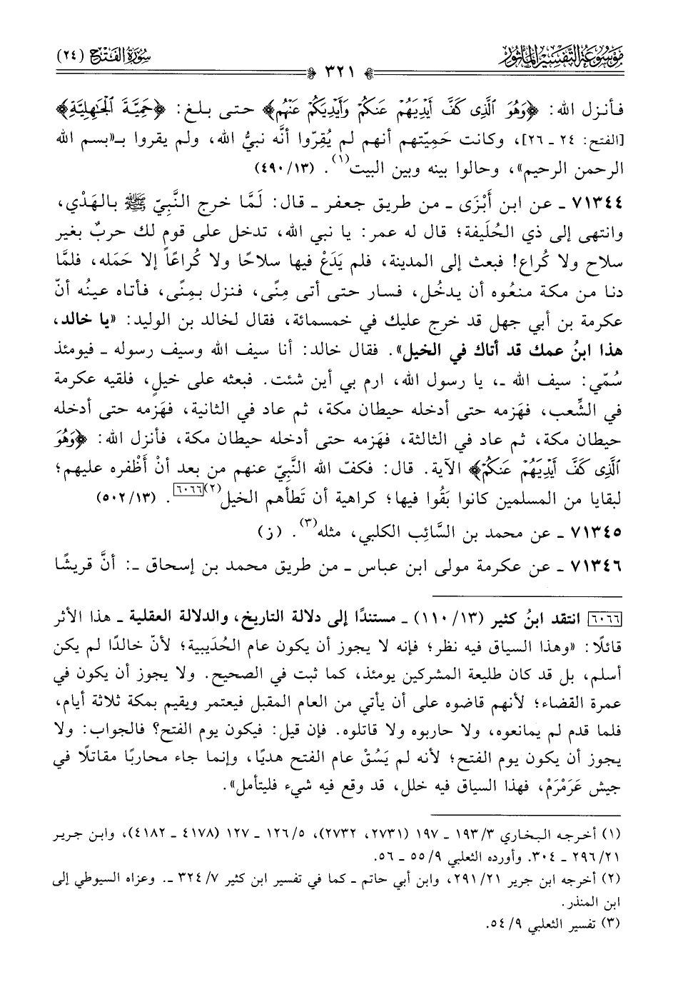 ٧١٣٤٤ - عن ابن أبْزى -من طريق جعفر- قال: لَمّا خرج النَّبِيّ - صلى الله عليه وسلم - بالهَدْي، وانتهى إلى ذي الحُلَيفة؛ قال له عمر: يا نبي الله، تدخل على قومٍ لك حربٌ بغير سلاح ولا كُراع! فبعث إلى المدينة، فلم يَدَعْ فيها سلاحًا ولا كُراعًا إلا حَمَله، فلمّا دنا من مكة منعُوه أن يدخُل، فسار حتى أتى مِنًى، فنزل بمِنًى، فأتاه عينُه أنّ عكرمة بن أبي جهل قد خرج عليك في خمسمائة، فقال لخالد بن الوليد: «يا خالد، هذا ابنُ عمك قد أتاك في الخيل». فقال خالد: أنا سيف الله وسيف رسوله -فيومئذ سُمّي: سيف الله-، يا رسول الله، ارم بي أين شئت. فبعثه على خيلٍ، فلقيه عكرمة في الشِّعب، فهَزمه حتى أدخله حيطان مكة، ثم عاد في الثانية، فهَزمه حتى أدخله حيطان مكة، ثم عاد في الثالثة، فهَزمه حتى أدخله حيطان مكة، فأنزل الله: {وهُوَ الَّذِي كَفَّ أيْدِيَهُمْ عَنْكُمْ} الآية. قال: فكفّ الله النَّبِيّ عنهم من بعد أنْ أظْفره عليهم؛ لبقايا من المسلمين كانوا بَقُوا فيها؛ كراهية أن تَطأهم الخيل (¬٢) [٦٠٦٦]. (١٣/ ٥٠٢)