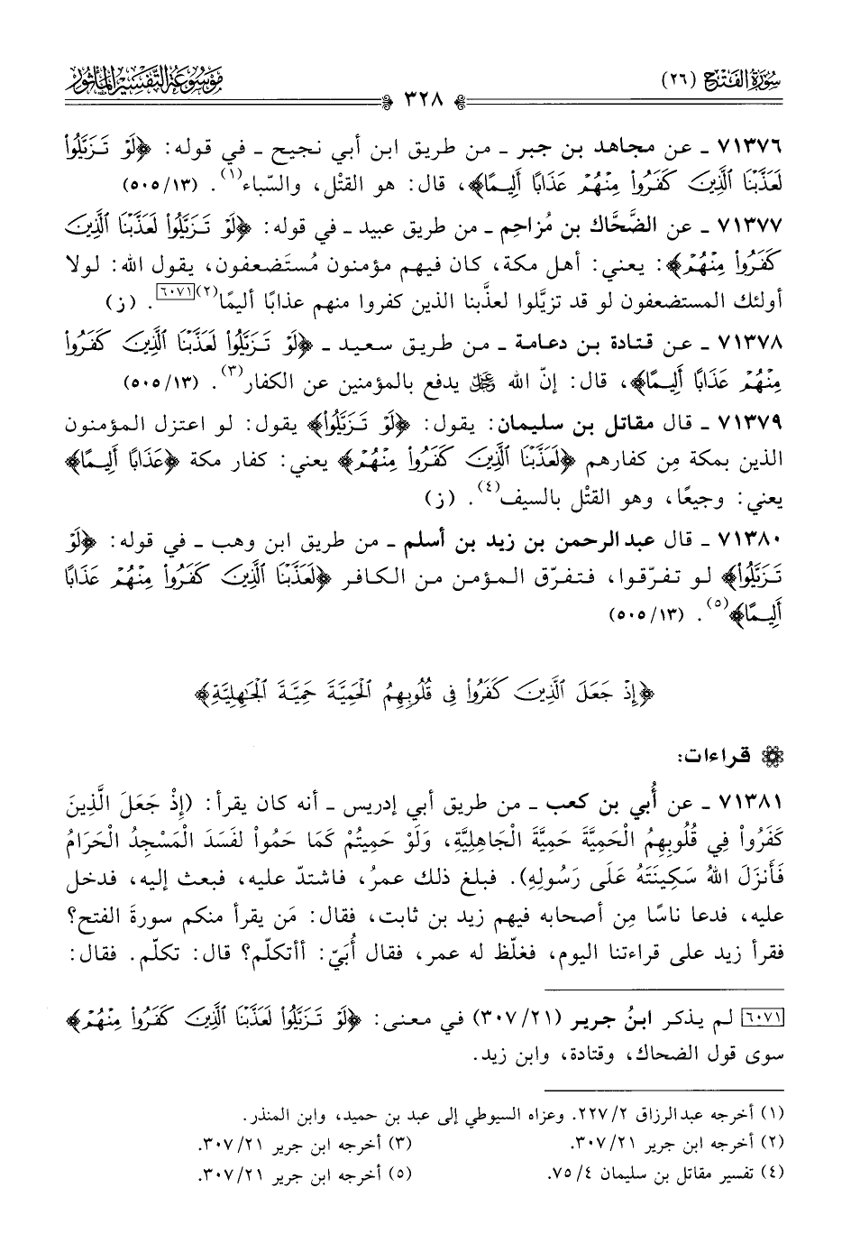 ٧١٣٧٨ - عن قتادة بن دعامة -من طريق سعيد- {لَوْ تَزَيَّلُوا لَعَذَّبْنا الَّذِينَ كَفَرُوا مِنهُمْ عَذابًا ألِيمًا}، قال: إنّ الله - عز وجل - يدفع بالمؤمنين عن الكفار (¬٣). (١٣/ ٥٠٥)