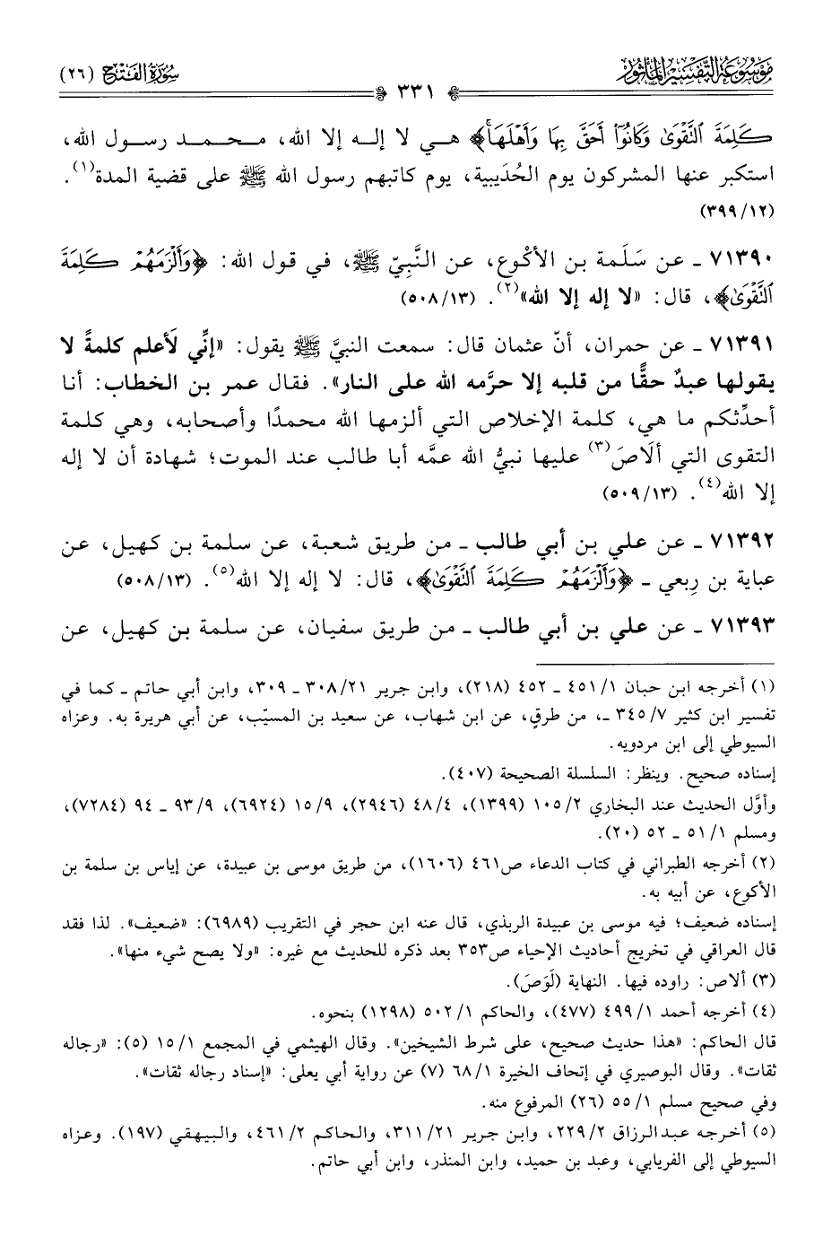 ٧١٣٩٢ - عن علي بن أبي طالب -من طريق شعبة، عن سلمة بن كهيل، عن عباية بن رِبعي- {وأَلْزَمَهُمْ كَلِمَةَ التَّقْوى}، قال: لا إله إلا الله (¬٥). (١٣/ ٥٠٨)