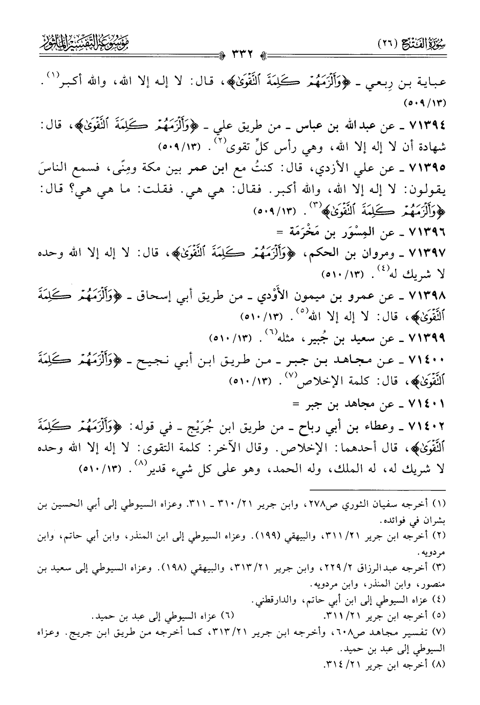 عباية بن رِبعي- {وأَلْزَمَهُمْ كَلِمَةَ التَّقْوى}، قال: لا إله إلا الله، والله أكبر (¬١). (١٣/ ٥٠٩)