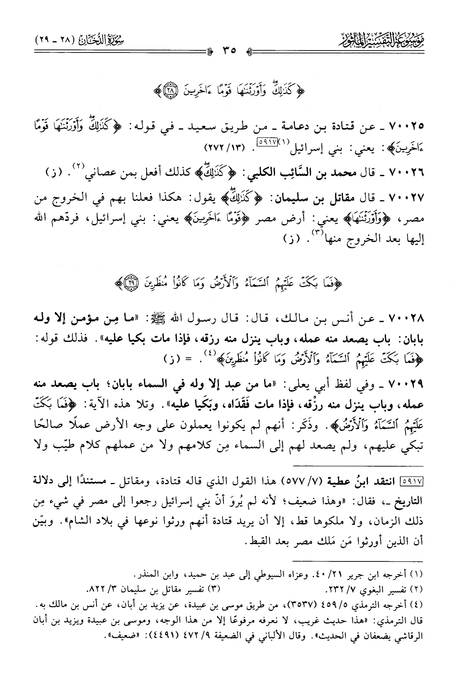 ٧٠٠٢٧ - قال مقاتل بن سليمان: {كَذلِكَ} يقول: هكذا فعلنا بهم في الخروج من مصر، {وأَوْرَثْناها} يعني: أرض مصر {قَوْمًا آخَرِينَ} يعني: بني إسرائيل، فردّهم الله إليها بعد الخروج منها (¬٣). (ز)