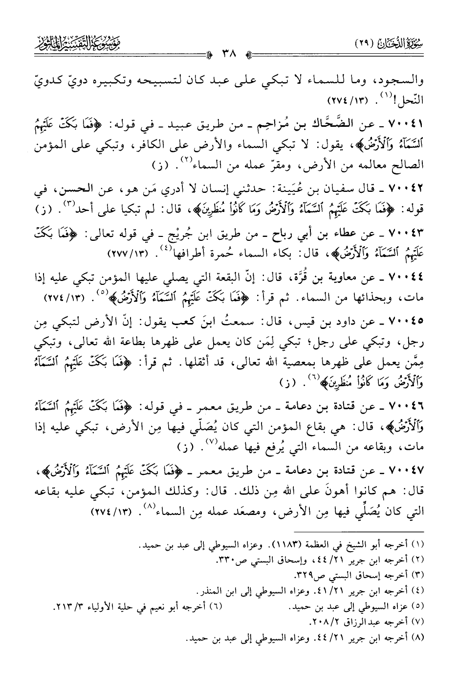 ٧٠٠٤٣ - عن عطاء بن أبي رباح -من طريق ابن جُريْج- في قوله تعالى: {فَما بَكَتْ عَلَيْهِمُ السَّماءُ والأَرْضُ}، قال: بكاء السماء حُمرة أطرافها (¬٤). (١٣/ ٢٧٧)