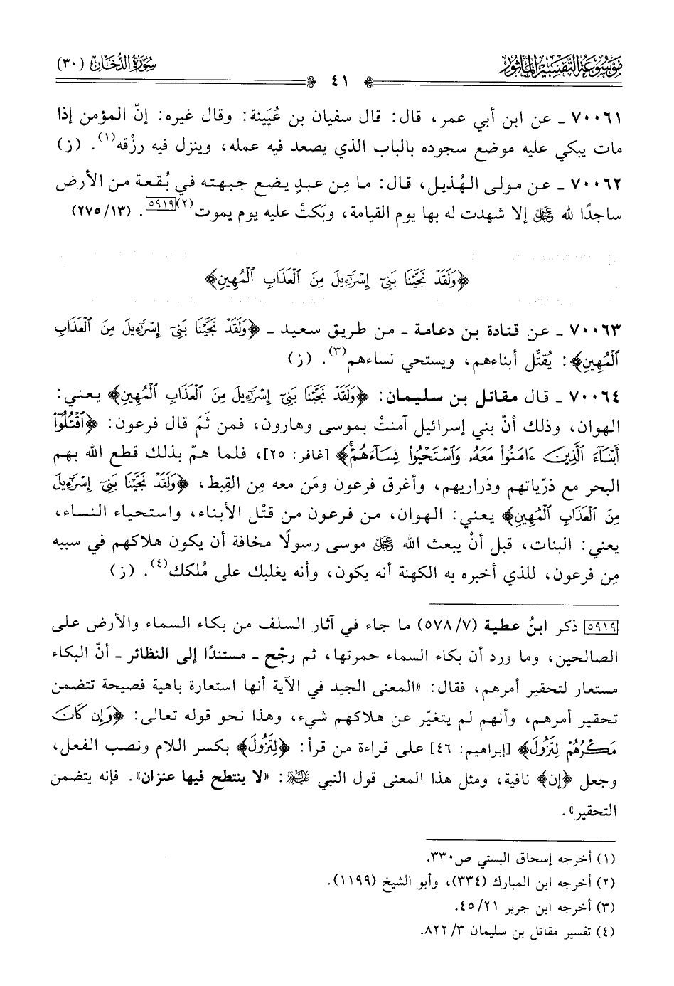 ٧٠٠٦٣ - عن قتادة بن دعامة -من طريق سعيد- {ولَقَدْ نَجَّيْنا بَنِي إسْرائِيلَ مِنَ العَذابِ المُهِينِ}: يُقتِّل أبناءهم، ويستحي نساءهم (¬٣). (ز)