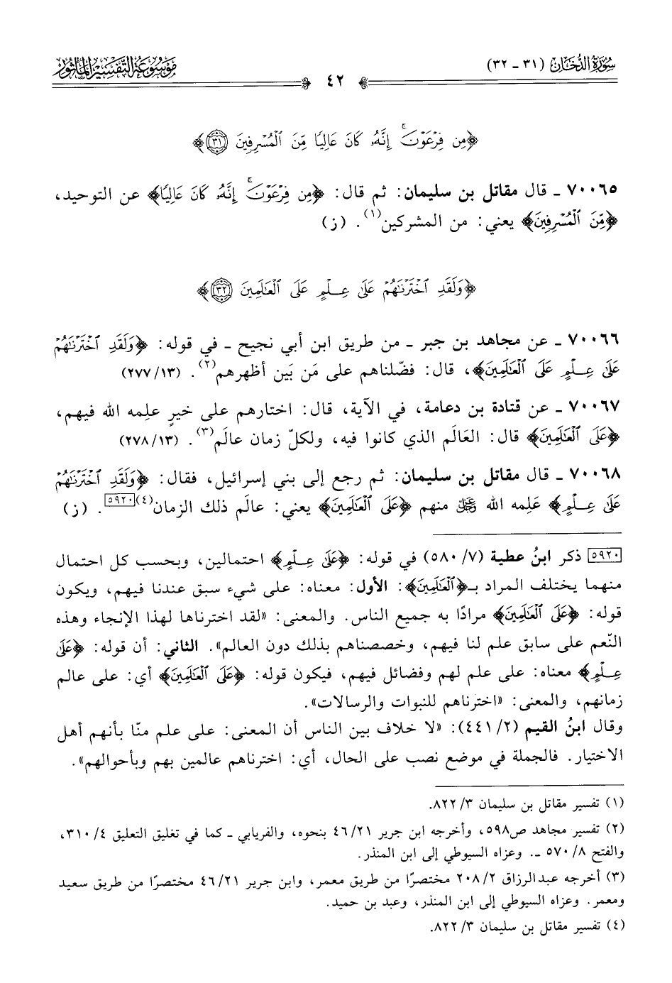 ٧٠٠٦٦ - عن مجاهد بن جبر -من طريق ابن أبي نجيح- في قوله: {ولَقَدِ اخْتَرْناهُمْ عَلى عِلْمٍ عَلى العالَمِينَ}، قال: فضّلناهم على مَن بَين أظهرهم (¬٢). (١٣/ ٢٧٧)