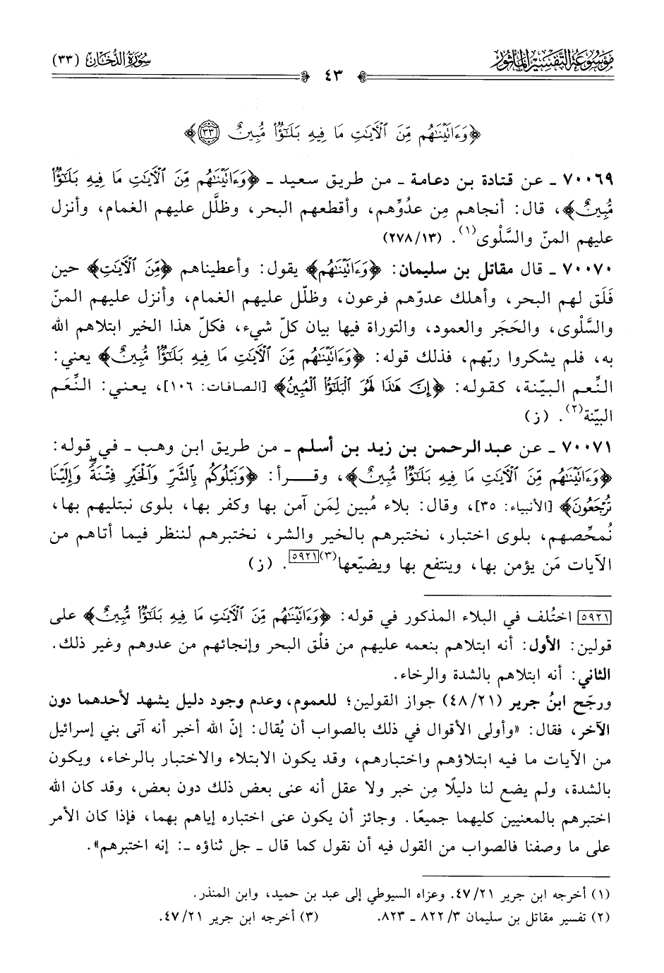 ٧٠٠٧١ - عن عبد الرحمن بن زيد بن أسلم -من طريق ابن وهب- في قوله: {وآتَيْناهُمْ مِنَ الآياتِ ما فِيهِ بَلاءٌ مُبِينٌ}، وقرأ: {ونَبْلُوكُمْ بِالشَّرِّ والخَيْرِ فِتْنَةً وإلَيْنا تُرْجَعُونَ} [الأنبياء: ٣٥]، وقال: بلاء مُبين لِمَن آمن بها وكفر بها، بلوى نبتليهم بها، نُمحِّصهم، بلوى اختبار، نختبرهم بالخير والشر، نختبرهم لننظر فيما أتاهم من الآيات مَن يؤمن بها، وينتفع بها ويضيّعها (¬٣) [٥٩٢١]. (ز)