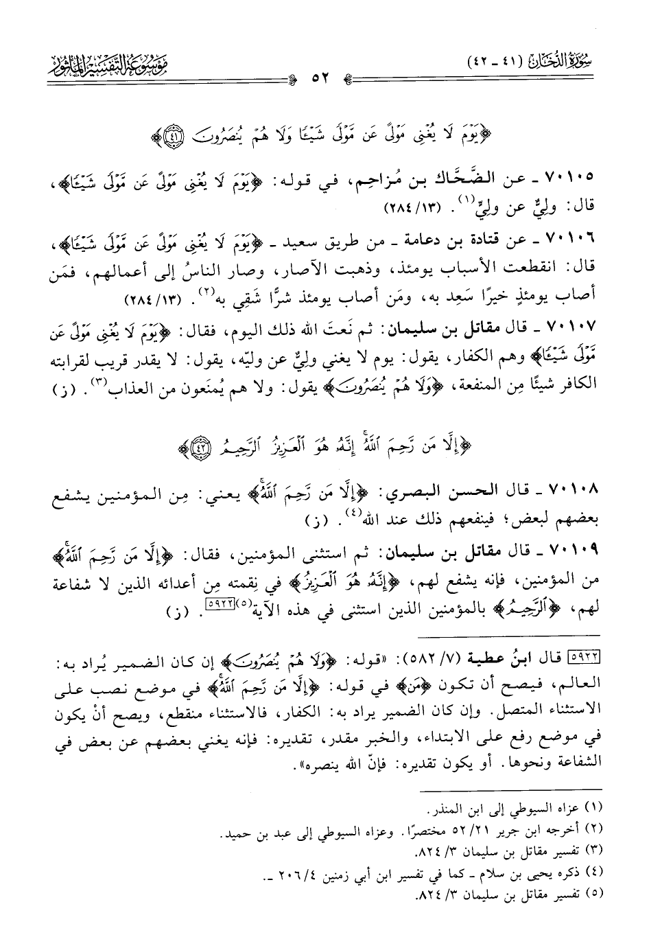 ٧٠١٠٧ - قال مقاتل بن سليمان: ثم نَعتَ الله ذلك اليوم، فقال: {يَوْمَ لا يُغْنِي مَوْلًى عَنْ مَوْلًى شَيْئًا} وهم الكفار، يقول: يوم لا يغني ولِيٌّ عن وليّه، يقول: لا يقدر قريب لقرابته الكافر شيئًا مِن المنفعة، {ولا هُمْ يُنْصَرُونَ} يقول: ولا هم يُمنَعون من العذاب (¬٣). (ز)