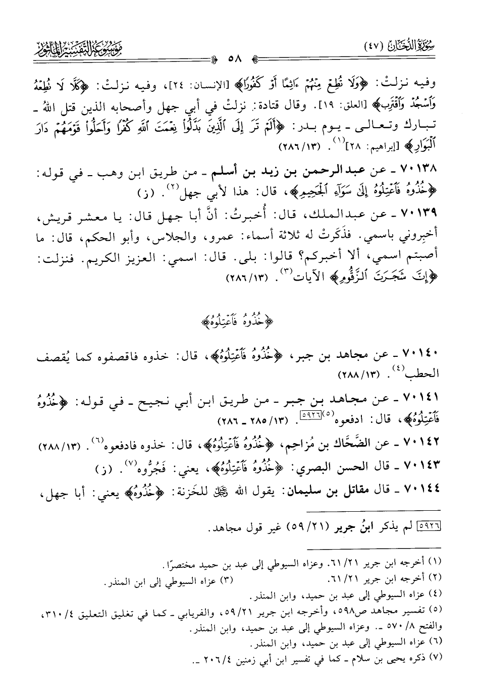 ٧٠١٤٠ - عن مجاهد بن جبر، {خُذُوهُ فاعْتِلُوهُ}، قال: خذوه فاقصفوه كما يُقصف الحطب (¬٤). (١٣/ ٢٨٨)