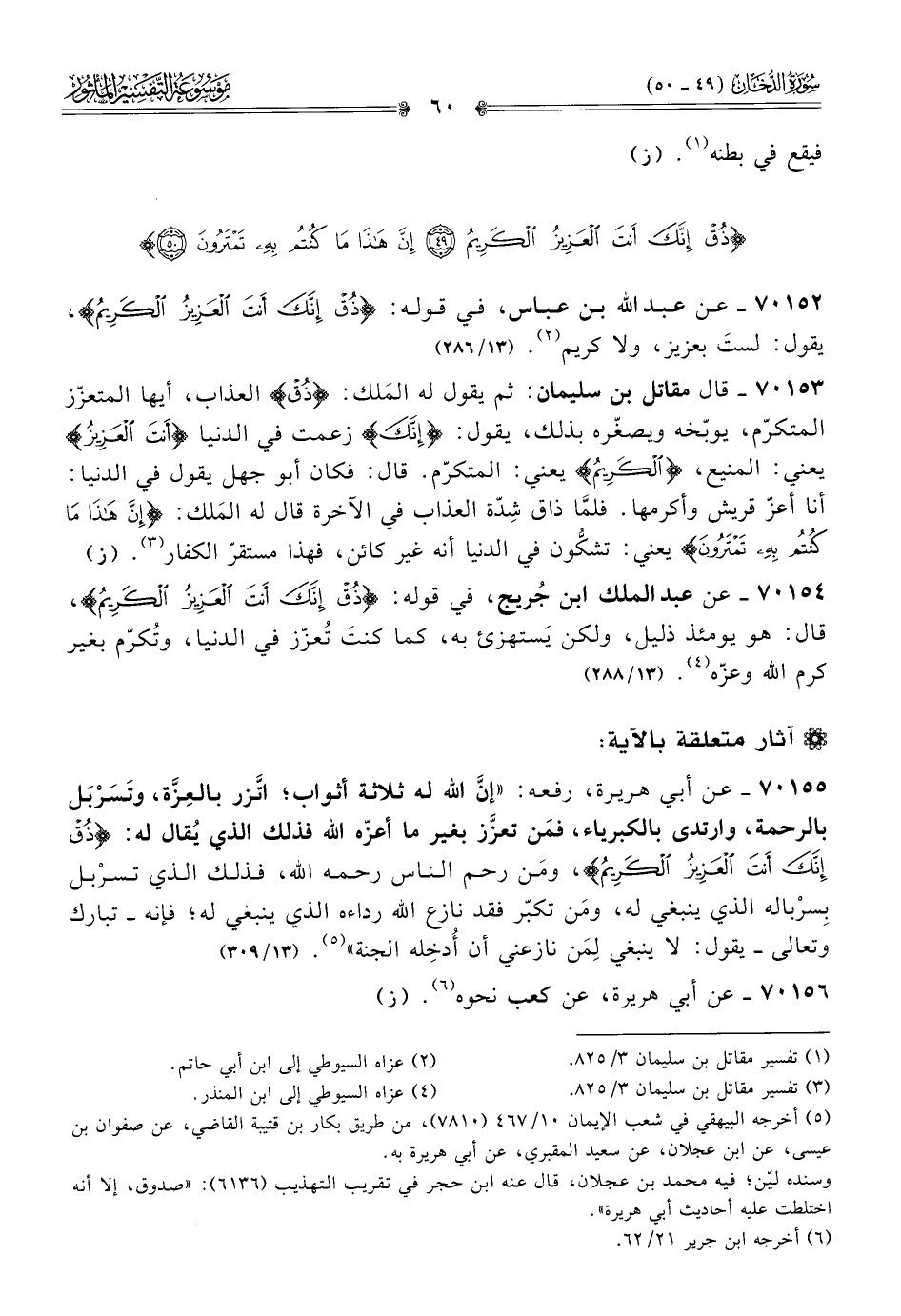 ٧٠١٥٢ - عن عبد الله بن عباس، في قوله: {ذُقْ إنَّكَ أنْتَ العَزِيزُ الكَرِيمُ}، يقول: لستَ بعزيز، ولا كريم (¬٢). (١٣/ ٢٨٦)