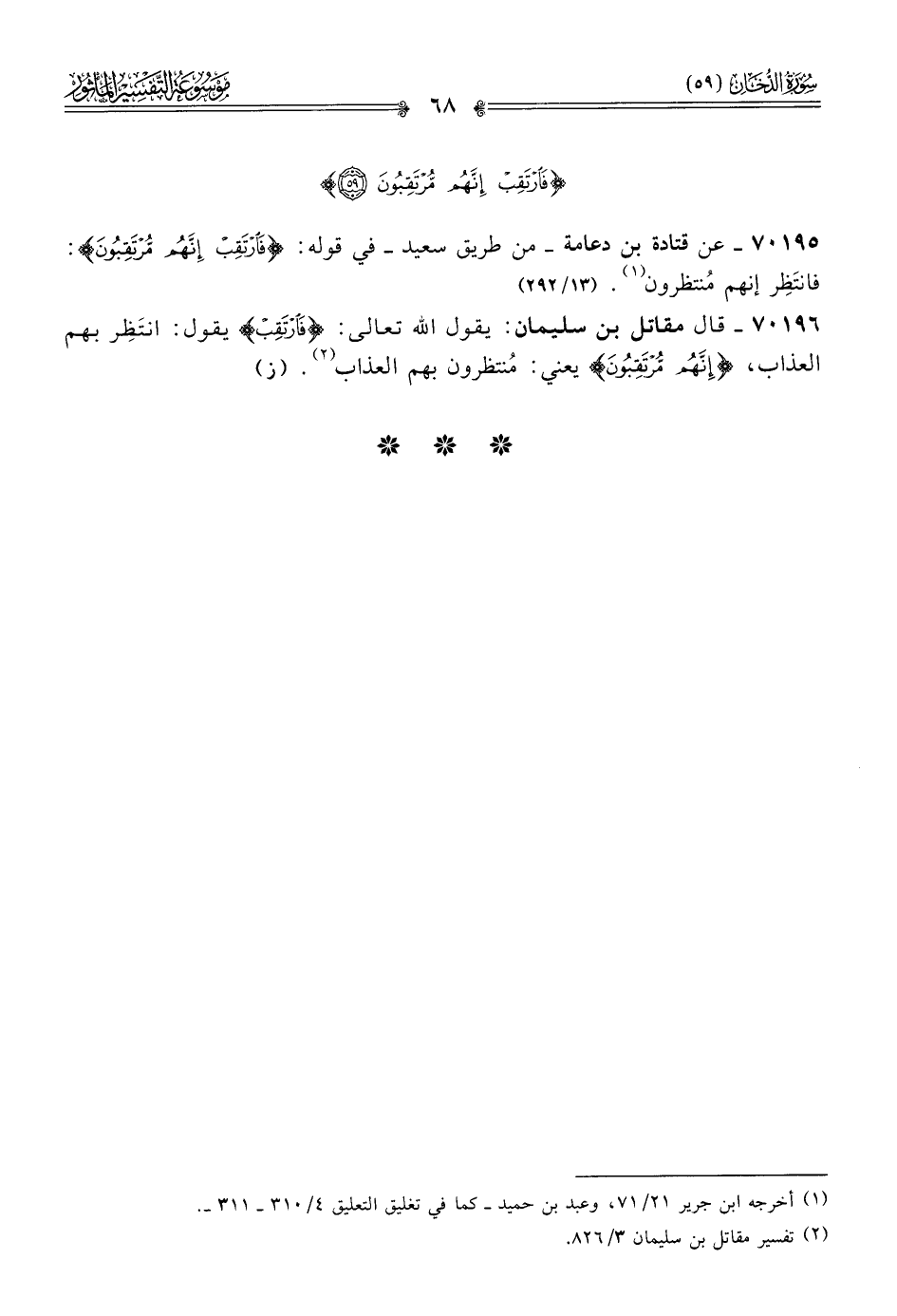 ٧٠١٩٥ - عن قتادة بن دعامة -من طريق سعيد- في قوله: {فارْتَقِبْ إنَّهُمْ مُرْتَقِبُونَ}: فانتَظِر إنهم مُنتظرون (¬١). (١٣/ ٢٩٢)