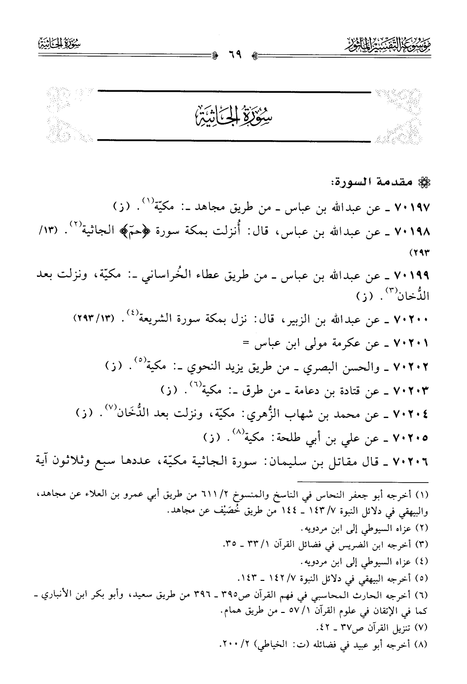 ٧٠٢٠٦ - قال مقاتل بن سليمان: سورة الجاثية مكيّة، عددها سبع وثلاثون آية