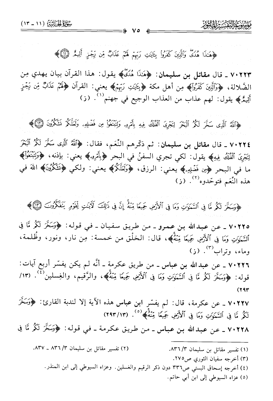 ٧٠٢٢٦ - عن عبد الله بن عباس -من طريق عكرمة- أنّه لم يكن يفسّر أربع آيات: قوله: {وسَخَّرَ لَكُمْ ما فِي السَّماواتِ وما فِي الأَرْضِ جَمِيعًا مِنهُ}، والرَّقيم، والغِسلين (¬٤). (١٣/ ٢٩٣)