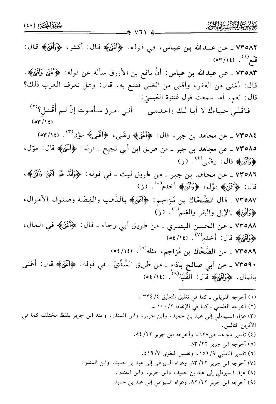٧٣٥٨٣ - عن عبد الله بن عباس: أنّ نافع بن الأزرق سأله عن قوله: {أغْنى وأَقْنى}. قال: أغنى من الفقر، وأقنى من الغنى فقنع به. قال: وهل تعرف العرب ذلك؟ قال: نعم، أما سمعت قول عَنترة العَبسيّ: