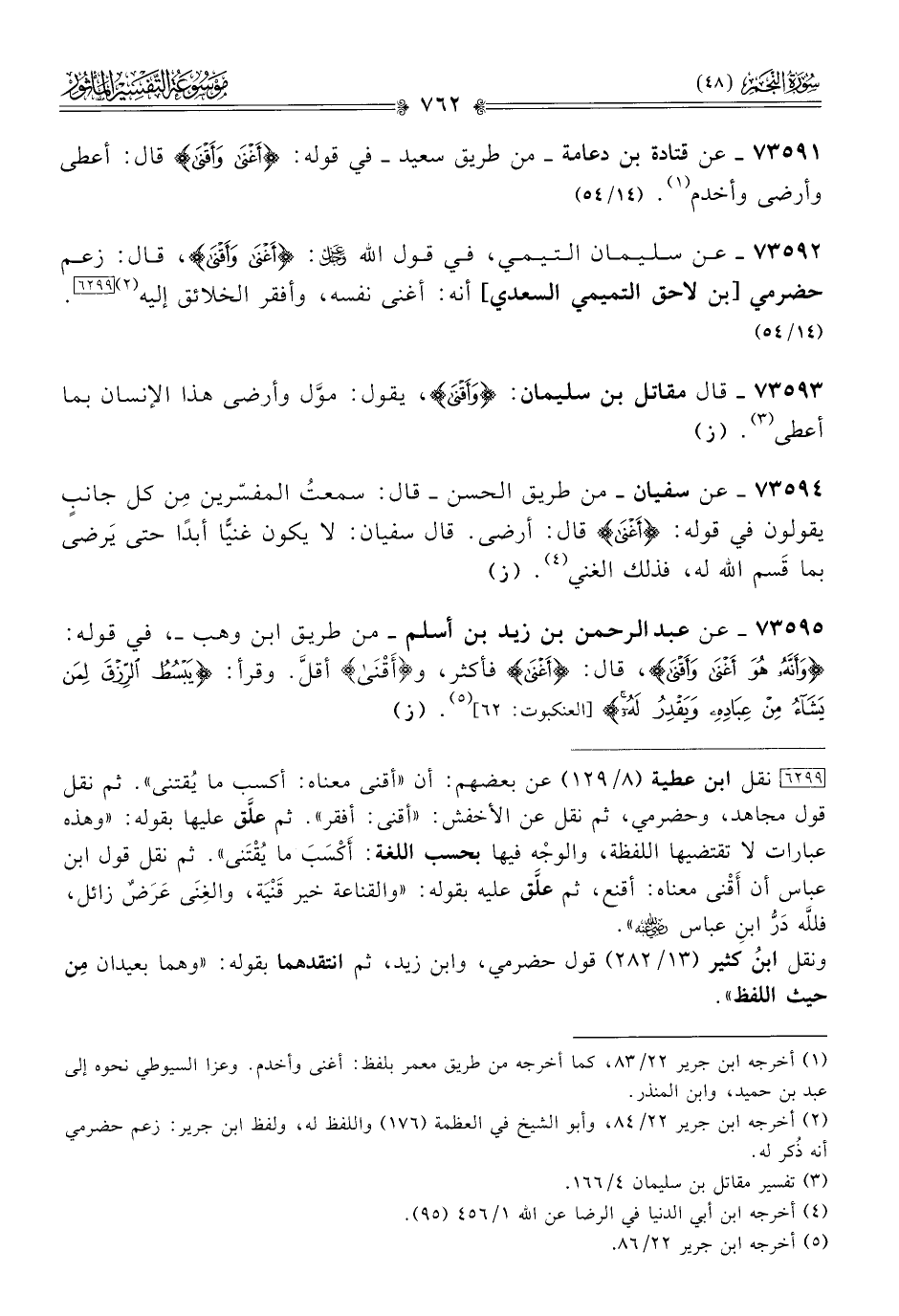 ٧٣٥٩٢ - عن سليمان التيمي، في قول الله - عز وجل -: {أغنى وأقنى}، قال: زعم حضرمي [بن لاحق التميمي السعدي] أنه: أغنى نفسه، وأفقر الخلائق إليه (¬٢) [٦٢٩٩]. (١٤/ ٥٤)