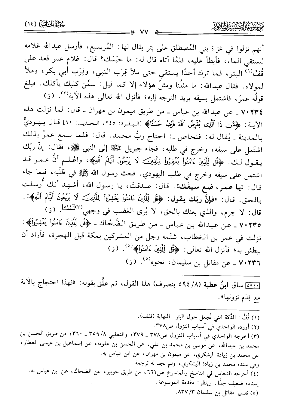 ٧٠٢٣٤ - عن عبد الله بن عباس -من طريق ميمون بن مهران- قال: لما نزلت هذه الآية: {مَن ذا الَّذِي يُقْرِضُ اللَّهَ قَرْضًا حَسَنًا} [البقرة: ٢٤٥، الحديد: ١١] قال يهوديٌّ بالمدينة -يُقال له: فنحاص-: احتاج ربُّ محمد. قال: فلما سمع عمرُ بذلك اشتَمل على سيفه، وخرج في طلبه، فجاء جبريل - عليه السلام - إلى النبي - صلى الله عليه وسلم -، فقال: إنّ ربّك يقول لك: {قُلْ لِلَّذِينَ آمَنُوا يَغْفِرُوا لِلَّذِينَ لا يَرْجُونَ أيّامَ اللَّهِ}، واعْلم أنّ عمر قد اشتمل على سيفه وخرج في طلب اليهودي. فبعث رسول الله - صلى الله عليه وسلم - في طَلَبه، فلما جاء قال: «يا عمر، ضع سيفَك». قال: صدقتَ، يا رسول الله، أشهد أنك أُرسلت بالحق. قال: «فإنّ ربّك يقول: {قُلْ لِلَّذِينَ آمَنُوا يَغْفِرُوا لِلَّذِينَ لا يَرْجُونَ أيّامَ اللَّهِ}». قال: لا جرم، والذي بعثك بالحق، لا يُرى الغضب في وجهي (¬٣) [٥٩٤٠]. (ز)