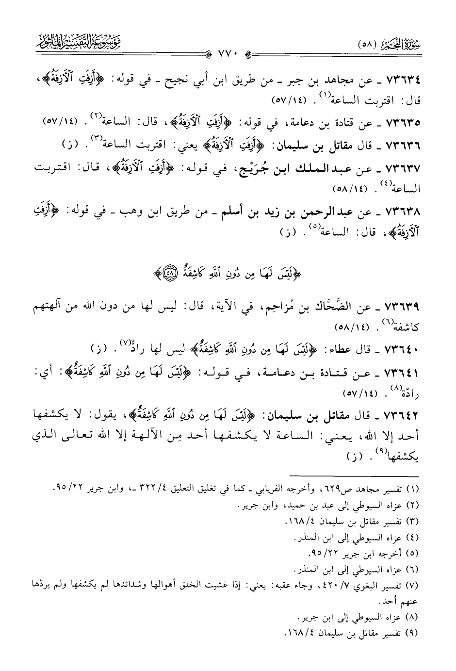 ٧٣٦٣٥ - عن قتادة بن دعامة، في قوله: {أزفت الآزفة}، قال: الساعة (¬٢). (١٤/ ٥٧)