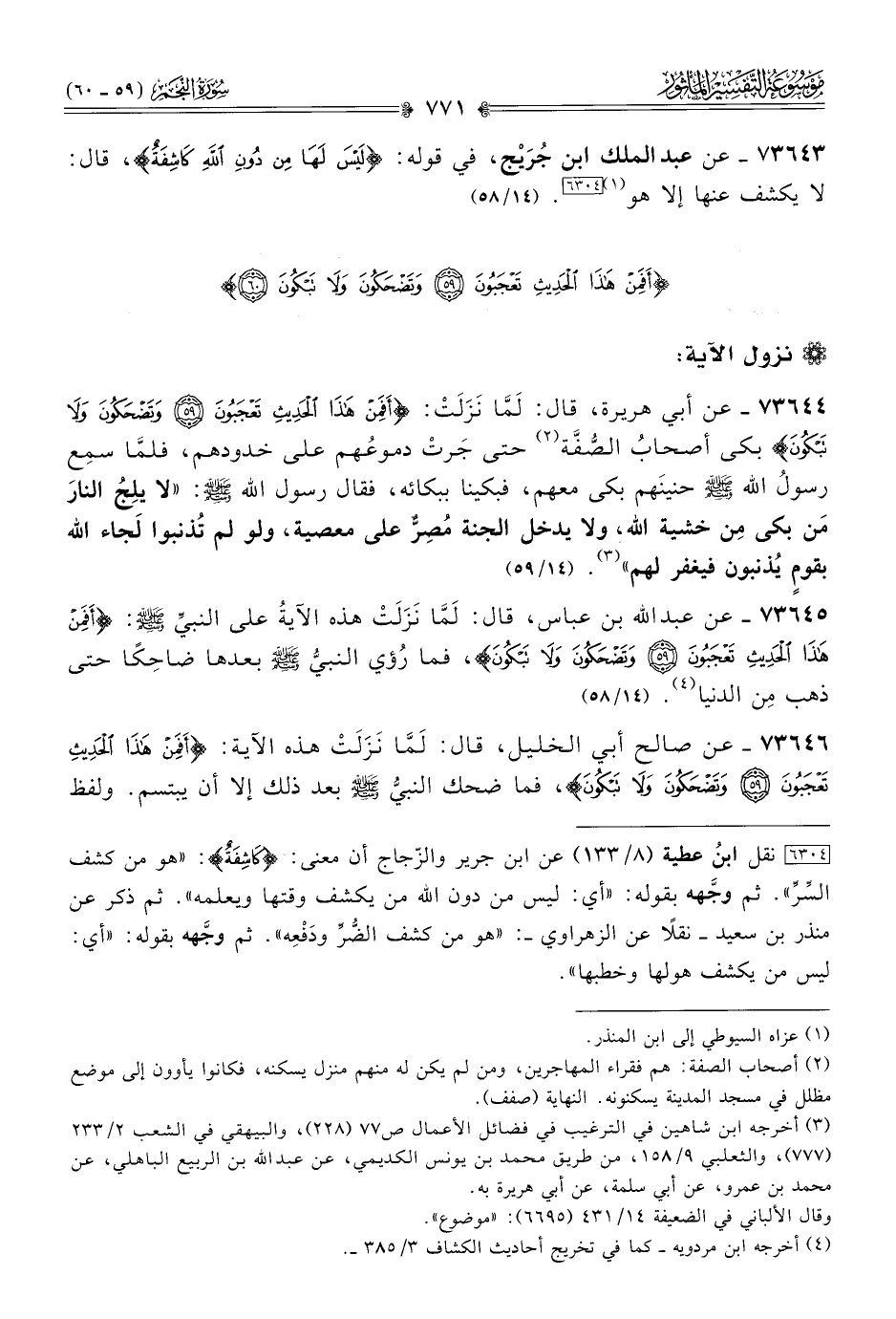 ٧٣٦٤٦ - عن صالح أبي الخليل، قال: لَمّا نَزَلَتْ هذه الآية: {أفَمِن هَذا الحَدِيثِ تَعْجَبُونَ وتَضْحَكُونَ ولا تَبْكُونَ}، فما ضحك النبيُّ - صلى الله عليه وسلم - بعد ذلك إلا أن يبتسم. ولفظ