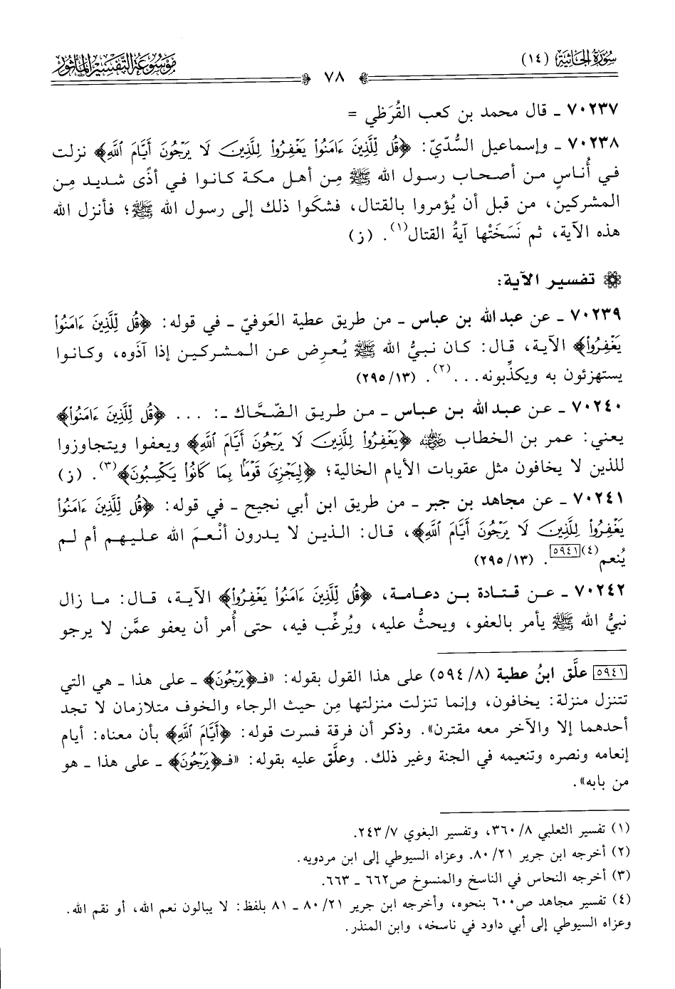 ٧٠٢٤٢ - عن قتادة بن دعامة، {قُلْ لِلَّذِينَ آمَنُوا يَغْفِرُوا} الآية، قال: ما زال نبيُّ الله - صلى الله عليه وسلم - يأمر بالعفو، ويحثُّ عليه، ويُرغِّب فيه، حتى أُمر أن يعفو عمَّن لا يرجو