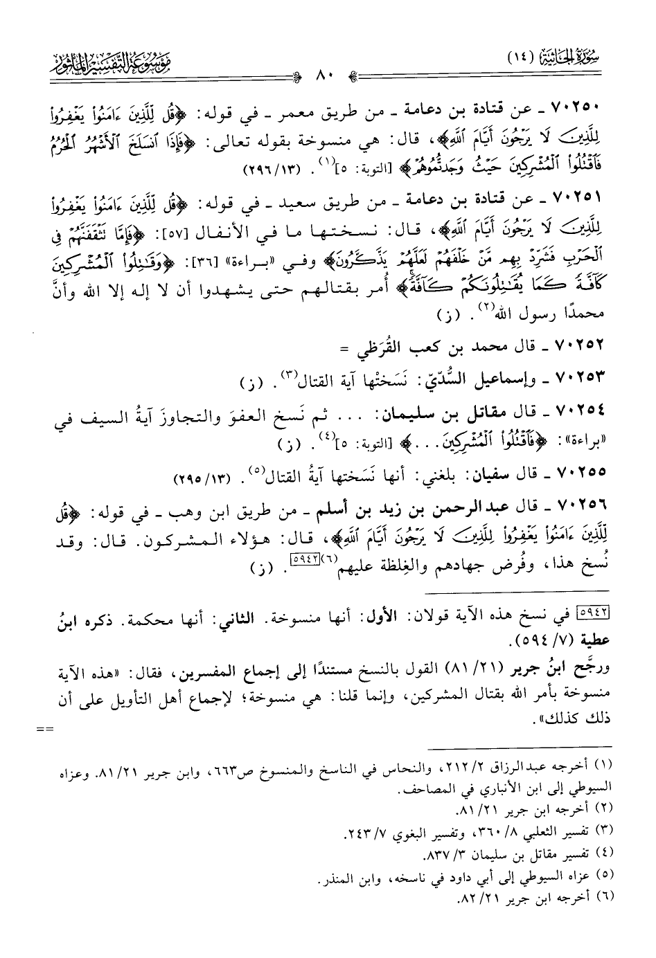 ٧٠٢٥٠ - عن قتادة بن دعامة -من طريق معمر- في قوله: {قُلْ لِلَّذِينَ آمَنُوا يَغْفِرُوا لِلَّذِينَ لا يَرْجُونَ أيّامَ اللَّهِ}، قال: هي منسوخة بقوله تعالى: {فَإذا انْسَلَخَ الأَشْهُرُ الحُرُمُ فاقْتُلُوا المُشْرِكِينَ حَيْثُ وجَدْتُمُوهُمْ} [التوبة: ٥] (¬١). (١٣/ ٢٩٦)