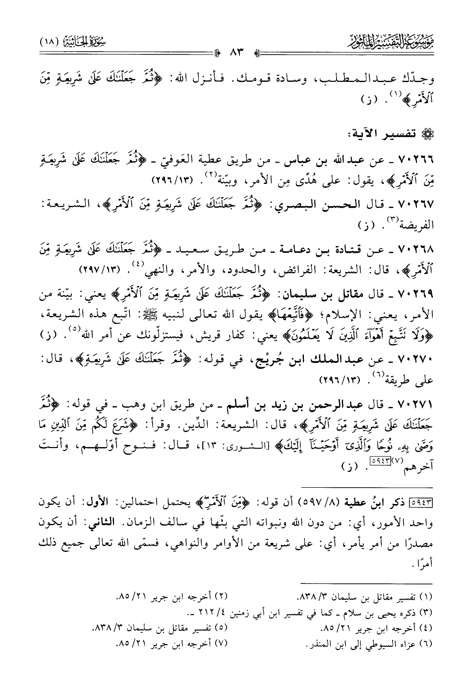 ٧٠٢٦٧ - قال الحسن البصري: {ثُمَّ جَعَلْناكَ عَلى شَرِيعَةٍ مِنَ الأَمْرِ}، الشريعة: الفريضة (¬٣). (ز)