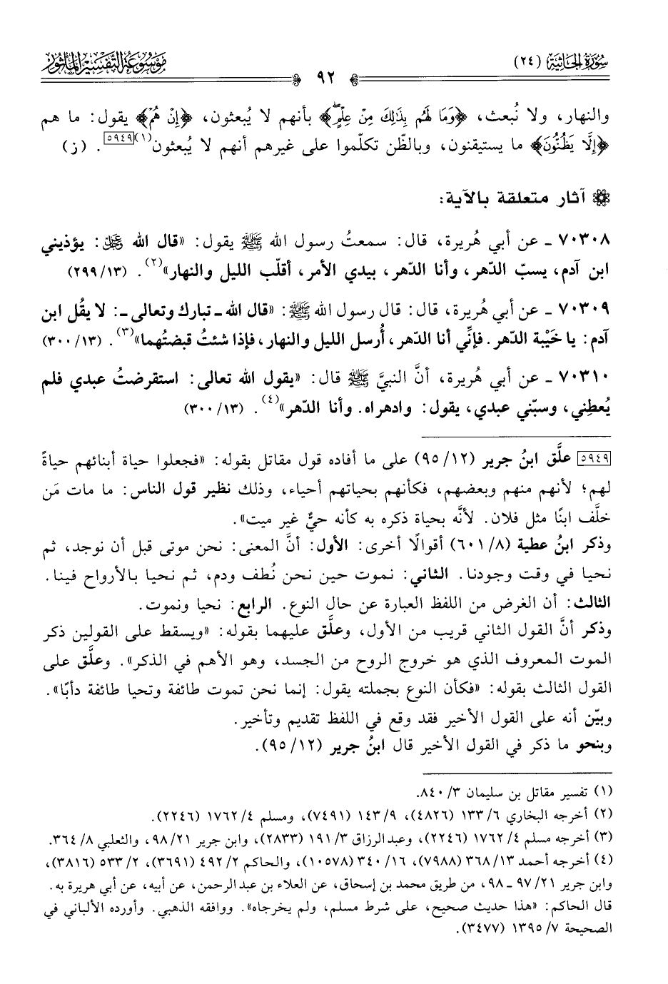 ٧٠٣٠٩ - عن أبي هُريرة، قال: قال رسول الله - صلى الله عليه وسلم -: «قال الله -تبارك وتعالى-: لا يقُل ابن آدم: يا خَيْبة الدّهر. فإنِّي أنا الدّهر، أُرسل الليل والنهار، فإذا شئتُ قبضتُهما» (¬٣). (١٣/ ٣٠٠)