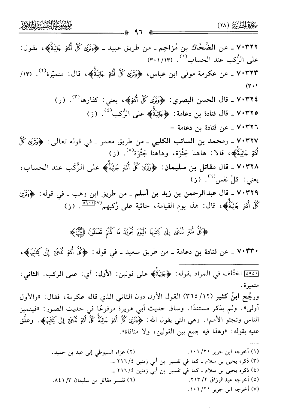 ٧٠٣٢٨ - قال مقاتل بن سليمان: {وتَرى كُلَّ أُمَّةٍ جاثِيَةً} على الرُّكَب عند الحساب، يعني: كلّ نفس (¬٦). (ز)