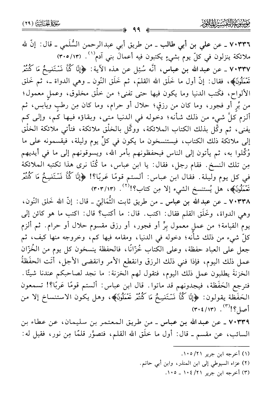 ٧٠٣٣٧ - عن عبد الله بن عباس، أنّه سُئِل عن هذه الآية: {إنّا كُنّا نَسْتَنْسِخُ ما كُنْتُمْ تَعْمَلُونَ}، فقال: إنّ أول ما خَلَق الله القلمَ، ثم خَلَق النّون -وهي الدواة-، ثم خَلق الألواح، فكَتب الدنيا وما يكون فيها حتى تفنى؛ من خلْق مخلوق، وعملٍ معمول؛ من بِّرٍ أو فجور، وما كان من رزقٍ؛ حلال أو حرام، وما كان مِن رطبٍ ويابس، ثم ألزم كلَّ شيء من ذلك شأنه؛ دخوله في الدنيا متى، وبقاؤه فيها كم، وإلى كم يفنى، ثم وكَّل بذلك الكتاب الملائكة، ووكَّل بالخلْق ملائكة، فتأتي ملائكة الخلْق إلى ملائكة ذلك الكتاب، فيستنسخون ما يكون في كلِّ يوم وليلة، فيقسمونه على ما وُكِّلوا به، ثم يأتون إلى الناس فيحفظونهم بأمر الله، ويسوقونهم إلى ما في أيديهم مِن تلك النسخ. فقام رجل، فقال: يا ابن عباس، ما كُنّا نرى هذا تكتبه الملائكة في كل يوم وليلة. فقال ابن عباس: ألستم قومًا عَربًا؟! {إنّا كُنّا نَسْتَنْسِخُ ما كُنْتُمْ تَعْمَلُونَ}، هل يُستنسخ الشيء إلا مِن كتاب؟! (¬٢).