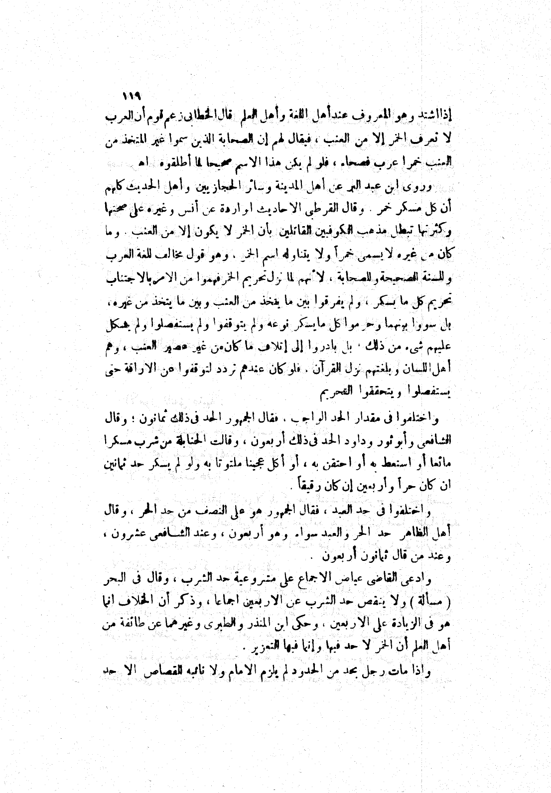 وما كان من غيره لا يسمى خمرا ولا يتناوله اسم الخمر، وهو قول مخالف للغة العرب وللسنة الصحيحة وللصحابة، لانهم لما نزل تحريم الخمر فهموا من الامر بالاجتناب تحريم كل ما يسكر، ولم يفرقوا بين ما يتخذ من العنب وبين ما يتخذ من غيره، بل سووا بينهما وحرموا كل ما يسكر نوعه ولم يتوقفوا ولم يستفصلوا ولم يشكل عليهم شئ من ذلك، بل بادروا إلى إتلاف ما كان من غير عصير العنب، وهم اهل اللسان وبلغتهم نزل القرآن، فلو كان عندهم تردد لتوقفوا عن الاراقة حتى يستفصلوا ويتحققوا التحريم.