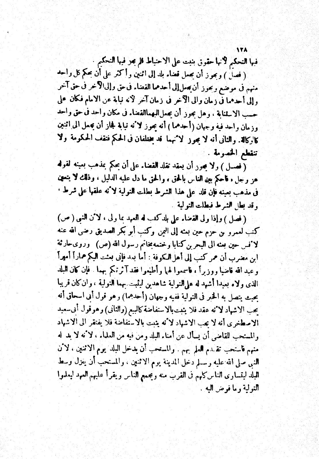 وإذا ولى القضاء على بلد كتب له العهد بما ولى، لِأَنَّ النَّبِيَّ صَلَّى اللَّهُ عَلَيْهِ وَسَلَّمَ كَتَبَ لعمرو بن حزم حين بعثه إلى اليمن وكتب أبو بكر الصديق رضى الله عنه لانس حين بعثه إلى البحرين كتابا وختمه بخاتم رَسُولِ اللَّهِ صَلَّى اللَّهُ عَلَيْهِ وَسَلَّمَ وَرَوَى حارثة ابن مضرب أن عمر كتب إلى أهل الكوفة: أما بعد فإنى بعثت اليكم عمارا أميرا وعبد الله قاضيا ووزيرا، فاسمعوا لهما وأطيعوا فقد آثرتكم بهما، فإن كان البلد الذى ولاه بعيدا أشهد له على التولية شاهدين ليثبت بهما التولية، وان كان قريبا بحيث يتصل به الخبر في التولية فَفِيهِ وَجْهَانِ