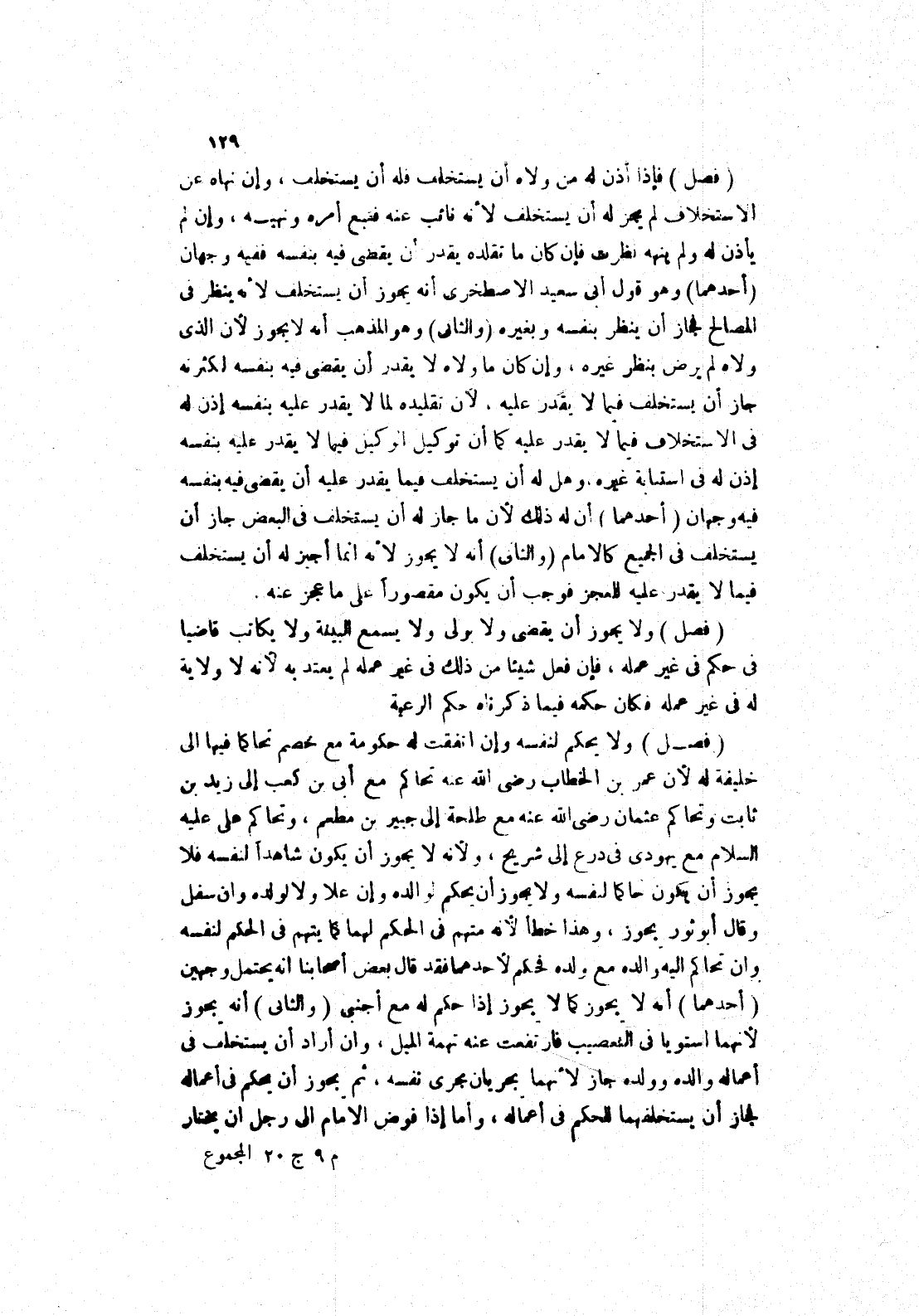 أنه يجوز لانهما استويا في التعصيب فارتفعت عنه تهمة الميل، وان أراد أن يستخلف في أعماله والده وولده جاز لانهما يجريان مجرى نفسه، ثم يجوز أن يحكم في أعماله فجاز أن يستخلفهما للحكم في أعماله، وأما إذا فوض الامام إلى رجل ان يختار