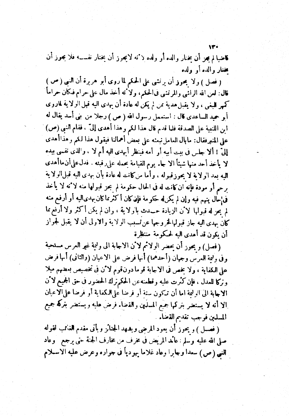 ولا يجوز أن يرتشى على الحكم لِمَا رَوَى أَبُو هُرَيْرَةَ أَنَّ النَّبِيَّ صَلَّى اللَّهُ عَلَيْهِ وَسَلَّمَ قال: لعن الله الراشى والمرتشي في الحكم، ولانه أخذ مال على حرام فكان حرام كمهر البغى، ولا يقبل هدية ممن لم يكن له عادة أن يهدى إليه قبل الولاية لما روى أبو حميد الساعدي قال: استعمل رَسُولُ اللَّهِ صَلَّى اللَّهُ عَلَيْهِ وَسَلَّمَ رَجُلًا من بنى أسد يقال له ابن اللتبية على الصدقة فلما قدم قال هذا لكم وهذا أهدى إلي، فقام النبي صلى الله عليه وسلم على المنبر فقال: ما بال العامل نبعثه على بعض أعمالنا فيقول هذا لكم وهذا أهدى إلي: ألا جلس في بيت أبيه أو أمه فينظر أيهدى إليه أم لا، والذى نفسي بيده لا يأخذ أحد منها شيئا الا جاء يوم القيامة يحملة على رقبته، فدل على أن ما أهدى إليه بعد الولاية لا يجوز قبوله، وأما من كانت له عادة بأن يهدى إليه قبل الولاية برحم أو مودة فإنه ان كانت له في الحال حكومة لم يجز قبولها منه لانه لا يأخذ في حال يتهم فيه وإن لم يكن له حكومة فإن كان أكثر مما كان يهدى إليه أو أرفع منه لم يجز له قبولها لان الزيادة حدث بالولاية، وان لم يكن أكثر ولا أرفع مما كان يهدى إليه جاز قبولها لخروجها عن تسبب الولاية والاولى أن لا يقبل لجواز أن يكون قد أهدى إليه لحكومة منتظرة.