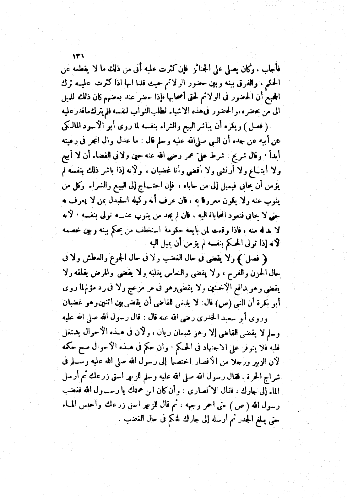 ولا يقضى في حال الغضب ولا في حال الجوع والعطش ولا في حال الحزن والفرح، ولا يقضى والنعاس يغلبه ولا يقضى والمرض يقلقه ولا يقضى وهو بدافع الاخبثين ولا يقضى وهو في حر مزعج ولا في رد مؤلم لما روى أبو بَكْرَةَ إنَّ النَّبِيَّ صَلَّى اللَّهُ عَلَيْهِ وَسَلَّمَ قَالَ: لا ينبغى للقاضى أن يقضى بين اثنين وهو غضبان وروى أَبُو سَعِيدٍ الْخُدْرِيُّ رَضِيَ اللَّهُ عَنْهُ قَالَ: قَالَ رَسُولُ اللَّهِ صَلَّى اللَّهُ عَلَيْهِ وَسَلَّمَ لَا يقضى القاضى إلا وهو شبعان ريان، ولان في هذه الاحوال يشتغل قبله فلا يتوفر على الاجتهاد في الحكم، وان حكم في هذه الاحوال صح حكمه لان الزبير ورجلا من الانصار اختصما إلَى رَسُولِ اللَّهِ صَلَّى اللَّهُ عَلَيْهِ وَسَلَّمَ في شراج الحرة، فَقَالَ رَسُولُ اللَّهِ صَلَّى اللَّهُ عَلَيْهِ وَسَلَّمَ للزبير اسق زرعك ثم أرسل الماء إلى جارك، فقال الانصاري: وأن كان ابن عمتك يا رسول الله فغضب رَسُولُ اللَّهِ صَلَّى اللَّهُ عَلَيْهِ وَسَلَّمَ حَتَّى احمر وجهه، ثم قال للزبير اسق زرعك والحبس الماء حتى يبلغ الجدر ثم أرسله إلى جارك فحكم في حال الغضب.