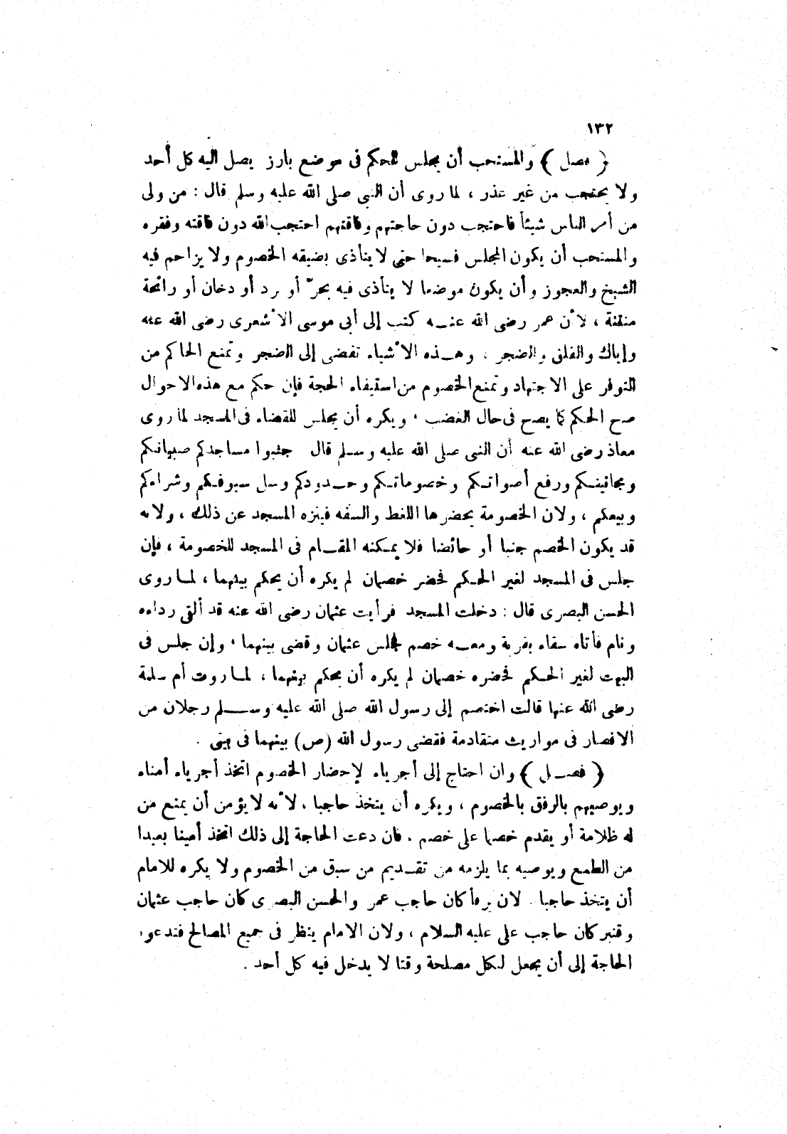 والمستحب أن يجلس للحكم في موضع بارز يصل إليه كل أحد ولا يحتجب من غير عذر، لِمَا رُوِيَ أَنَّ النَّبِيَّ صَلَّى اللَّهُ عَلَيْهِ وَسَلَّمَ قَالَ: من ولى من أمر الناس شيئا فاحتجب دون حاجتهم وفاقتهم احتجب الله دون فاقته وفقره والمستحب أن يكون المجلس فسيحا حتى لا يتأذى بضيقه الخصوم ولا يزاحم فيه الشيخ والعجوز وأن يكون موضعا لا يتأذى فيه بحر أو برد أو دخان أو رائحة منتنة، لان عمر رَضِيَ اللَّهُ عَنْهُ كَتَبَ إلَى أَبِي مُوسَى الاشعري رضى الله عنه وإياك والقلق والضجر، وهذه الاشياء تفضى إلى الضجر وتمنع الحاكم من التوفر على الاجتهاد وتمنع الخصوم من استيفاء الحجة فإن حكم مع هذه الاحوال صح الحكم كما يصح في حال الغضب، ويكره أن يجلس للقضاء في المسجد لِمَا رَوَى