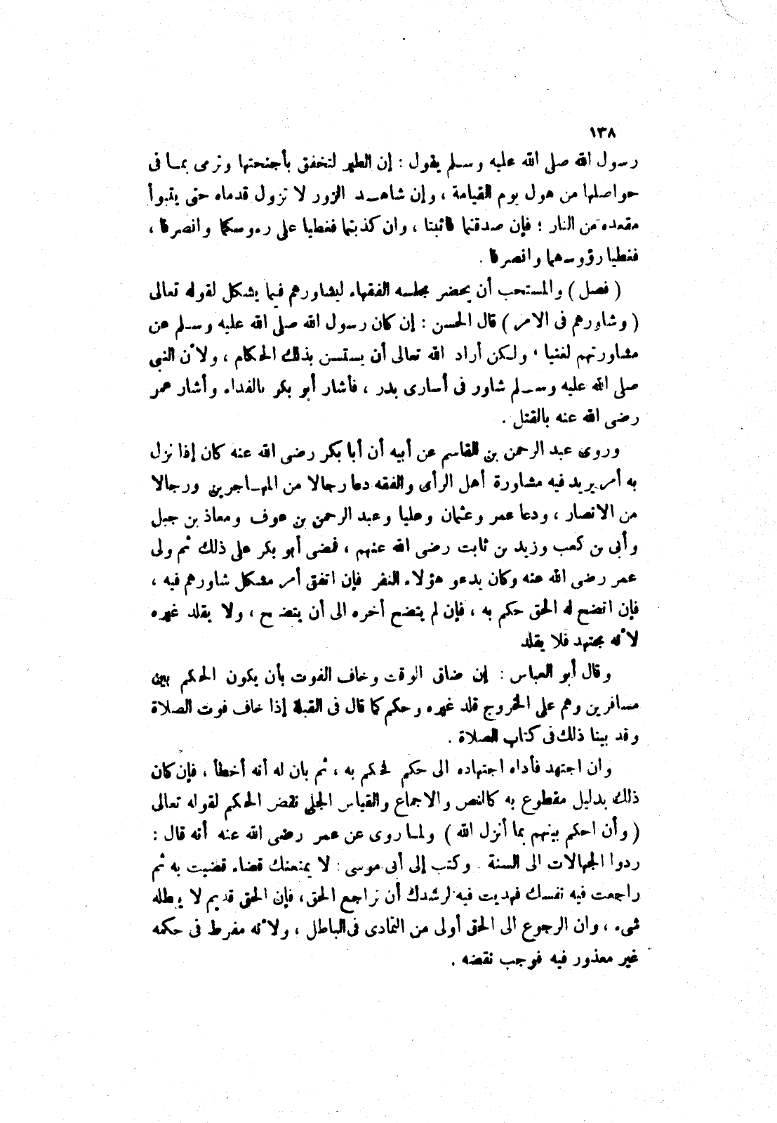 وروى عَبْدِ الرَّحْمَنِ بْنِ الْقَاسِمِ عَنْ أَبِيهِ أَنَّ أبا بكر رضى الله عنه كان إذا نزل به أمر يريد فيه مشاورة أهل الرأى والفقه دعا رجالا من المهاجرين ورجالا من الانصار، ودعا عمر وعثمان وعليا وعبد الرحمن بن عوف ومعاذ بن جبل وأبى بن كعب وزيد بن ثابت رضى الله عنهم، فمضى أبو بكر على ذلك ثم ولى عمر رضى الله عنه وكان يدعو هؤلاء النفر فإن اتفق أمر مشكل شاورهم فيه، فإن اتضح له الحق حكم به، فإن لم يتضح أخره إلى أن يتضح، ولا يقلد غيره لانه مجتهد فلا يقلد.